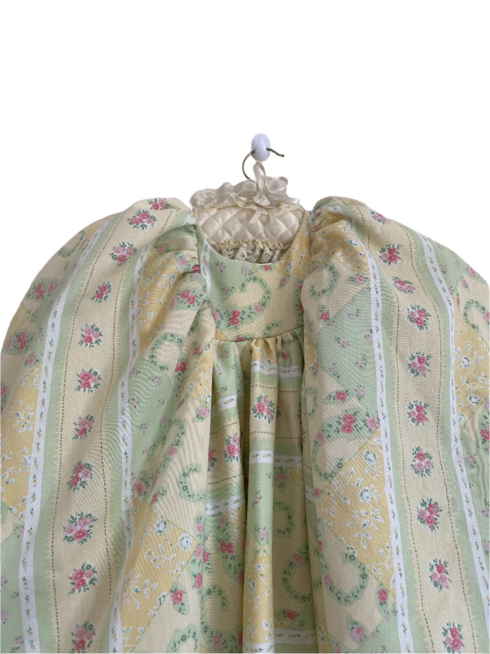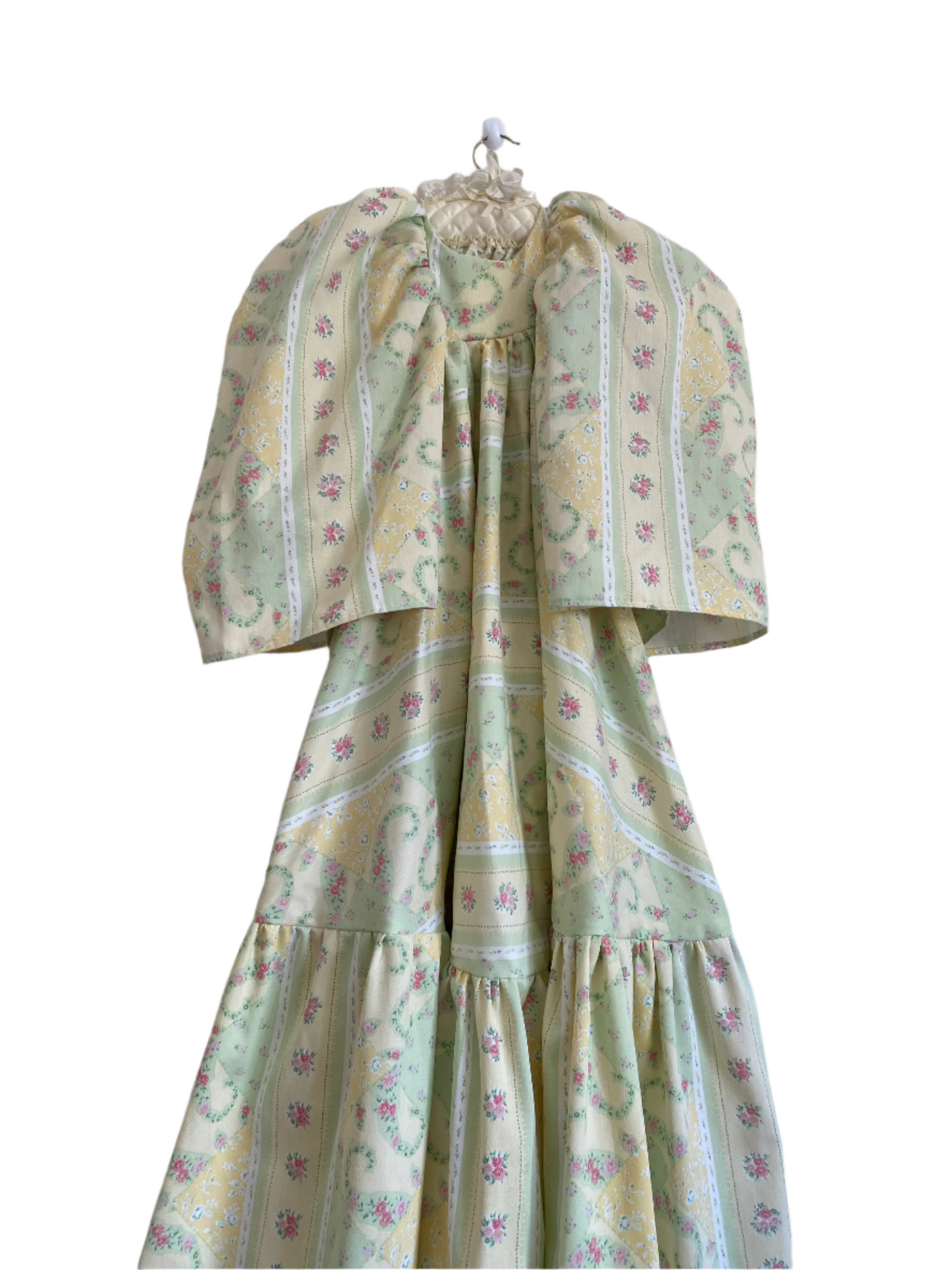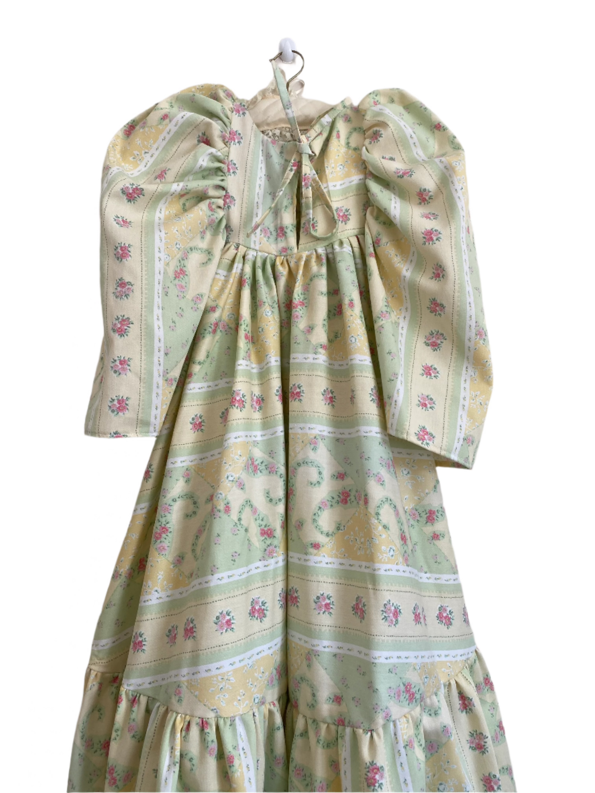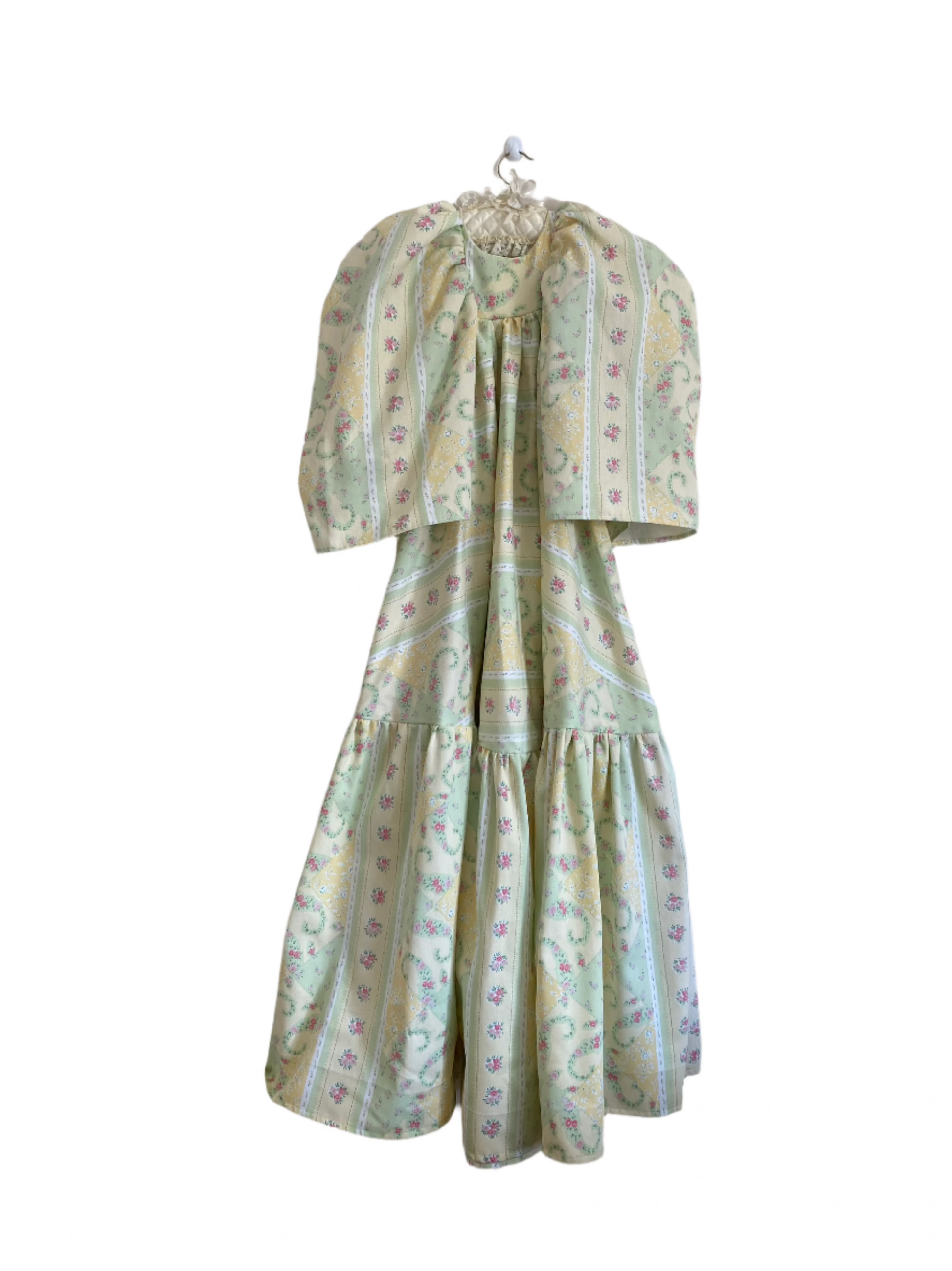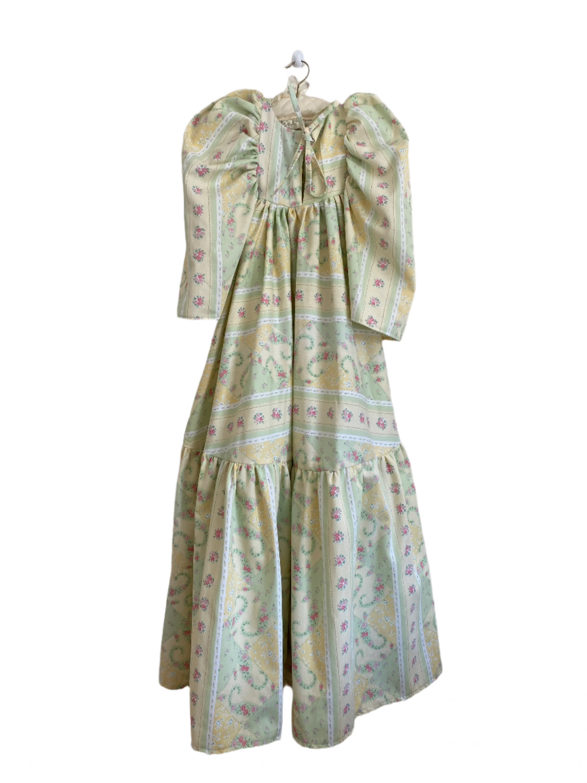 Made from upcycled vintage curtains, The Charlotte Dress is a structured piece with timeless appeal. The heavyweight fabric gives it a sculptural silhouette, allowing the long length and voluminous sleeves to hold their shape beautifully. A cropped bib front adds a subtle focal point, while the delicate ditsy floral print and fresh colour palette evoke a classic, countryside charm. Finished with a tie-back detail for a flattering fit, this dress is where elegance meets sustainability.