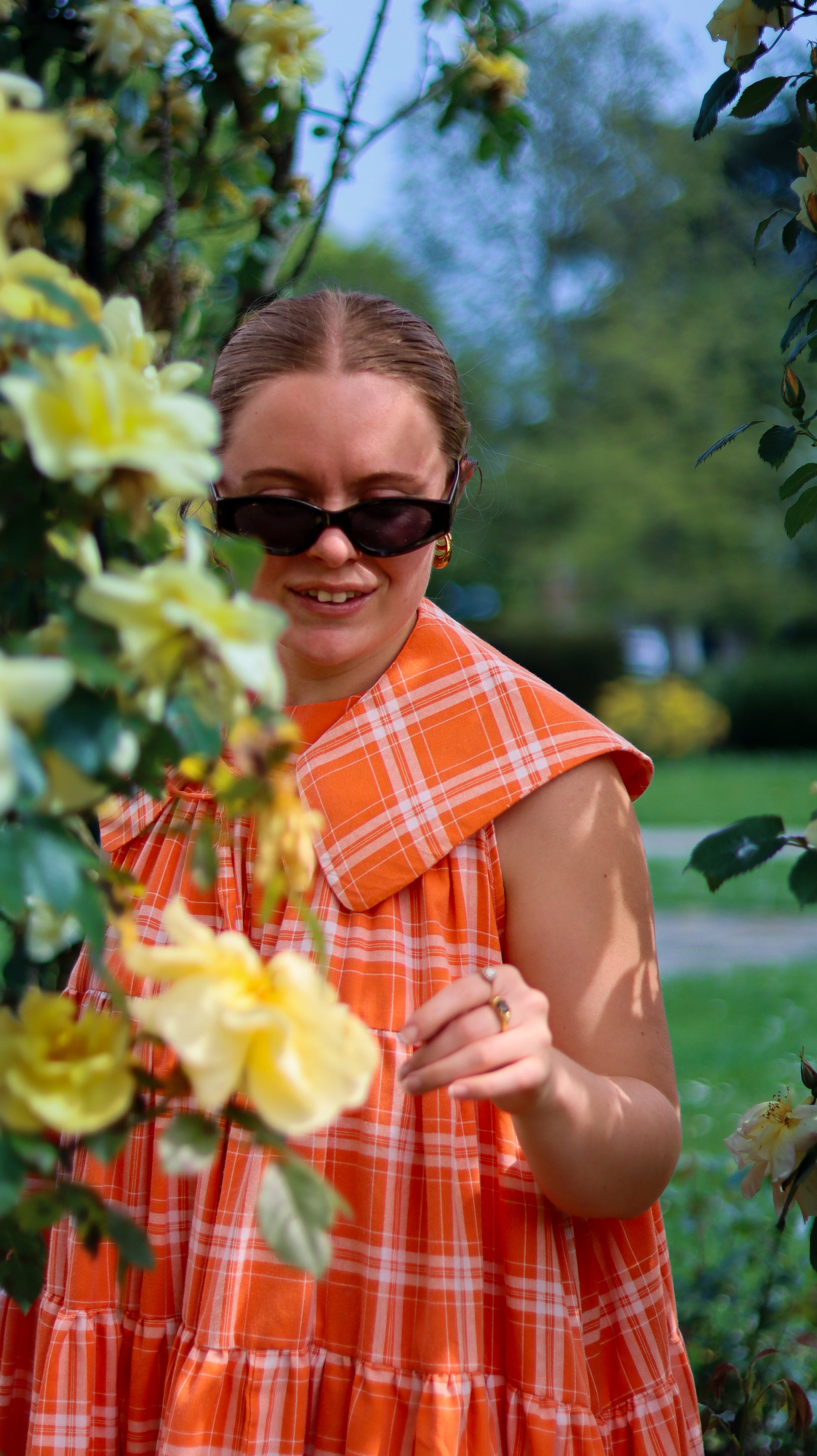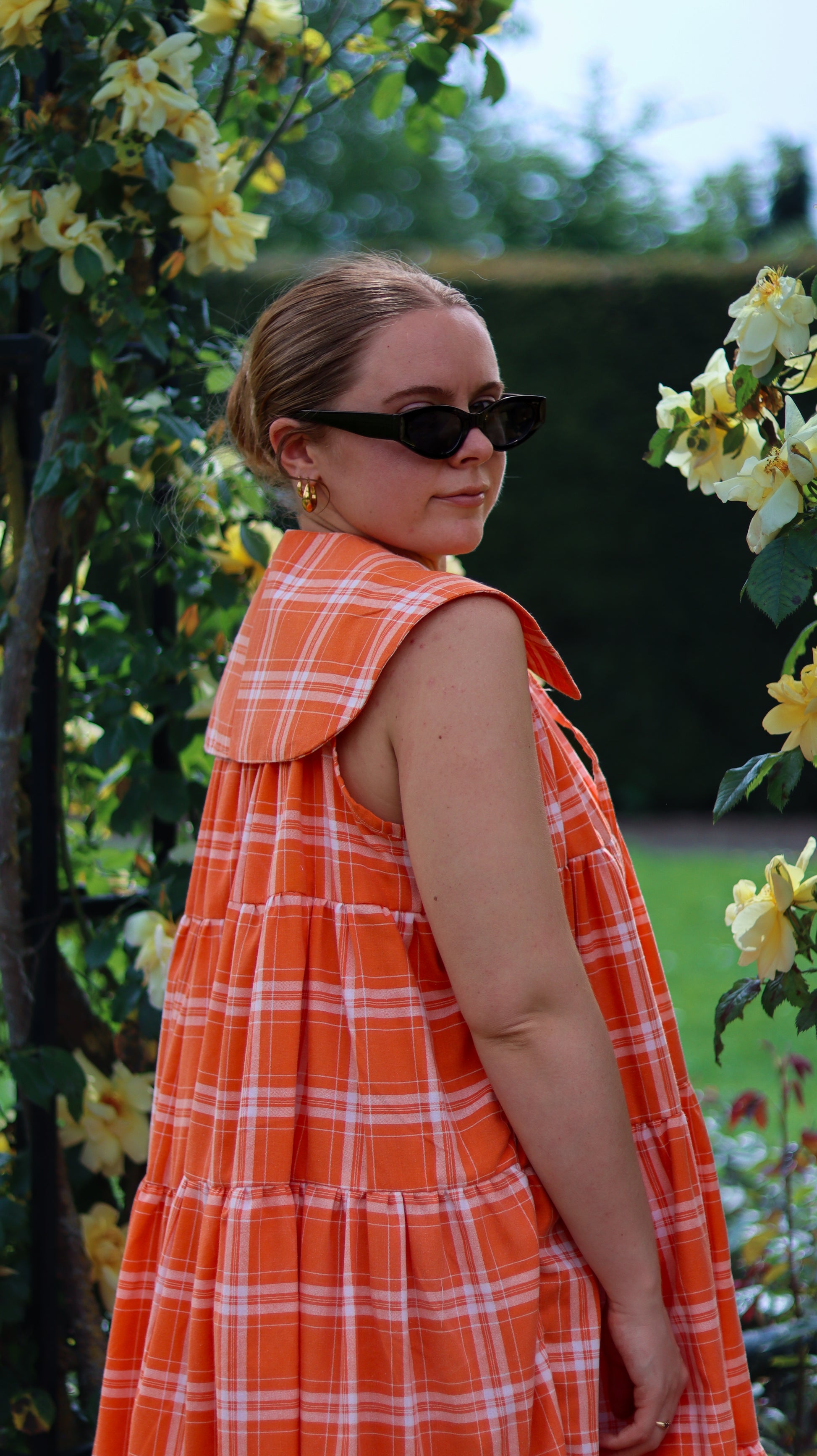 Discover the Charlotte Dress, made from up-cycled vintage bedding in an organic orange check pattern. The detachable collar adds versatility while the tiered sections create volume for a flattering silhouette. Perfect for any occasion, this mid length dress is both sustainable and stylish.