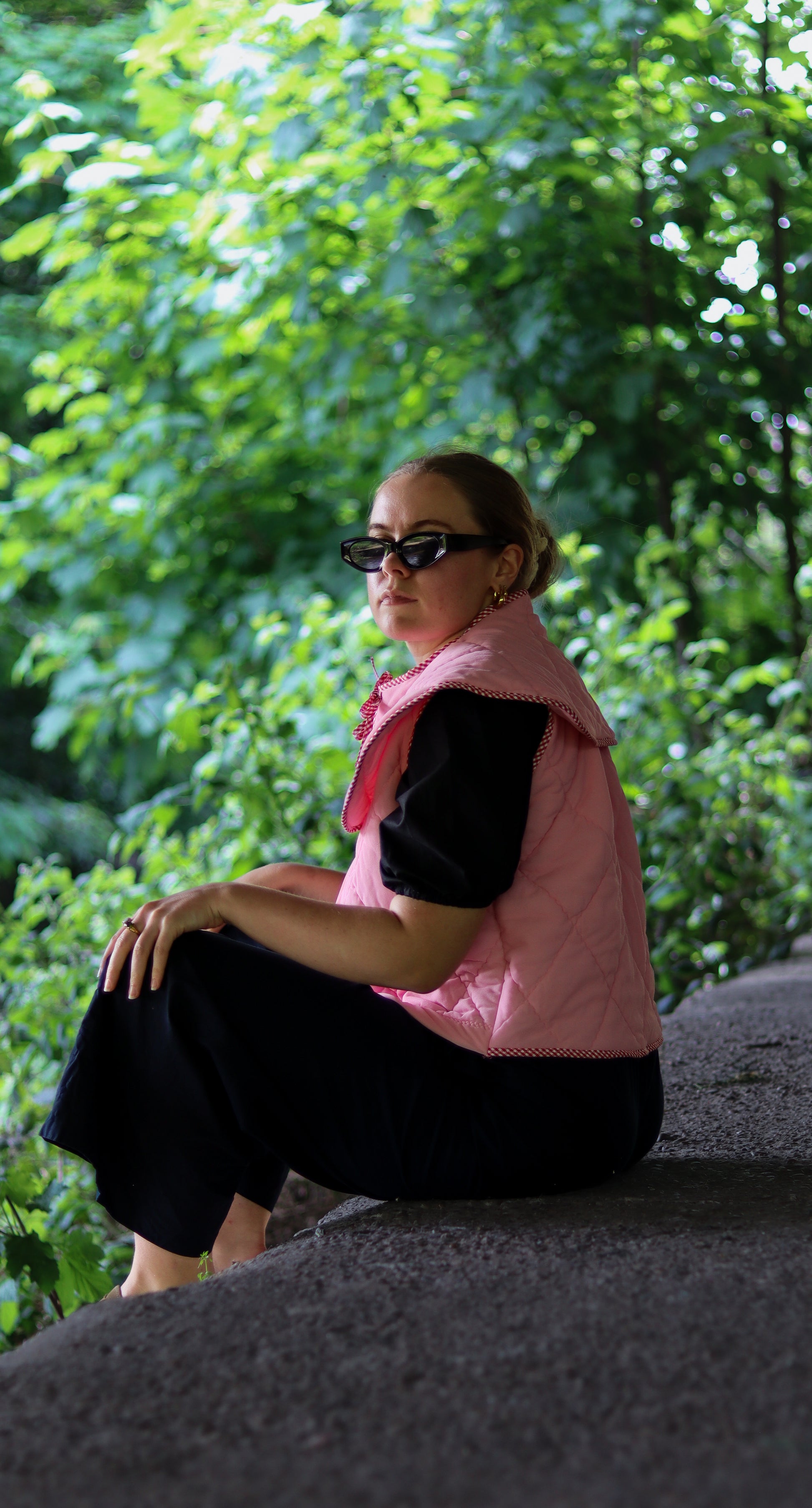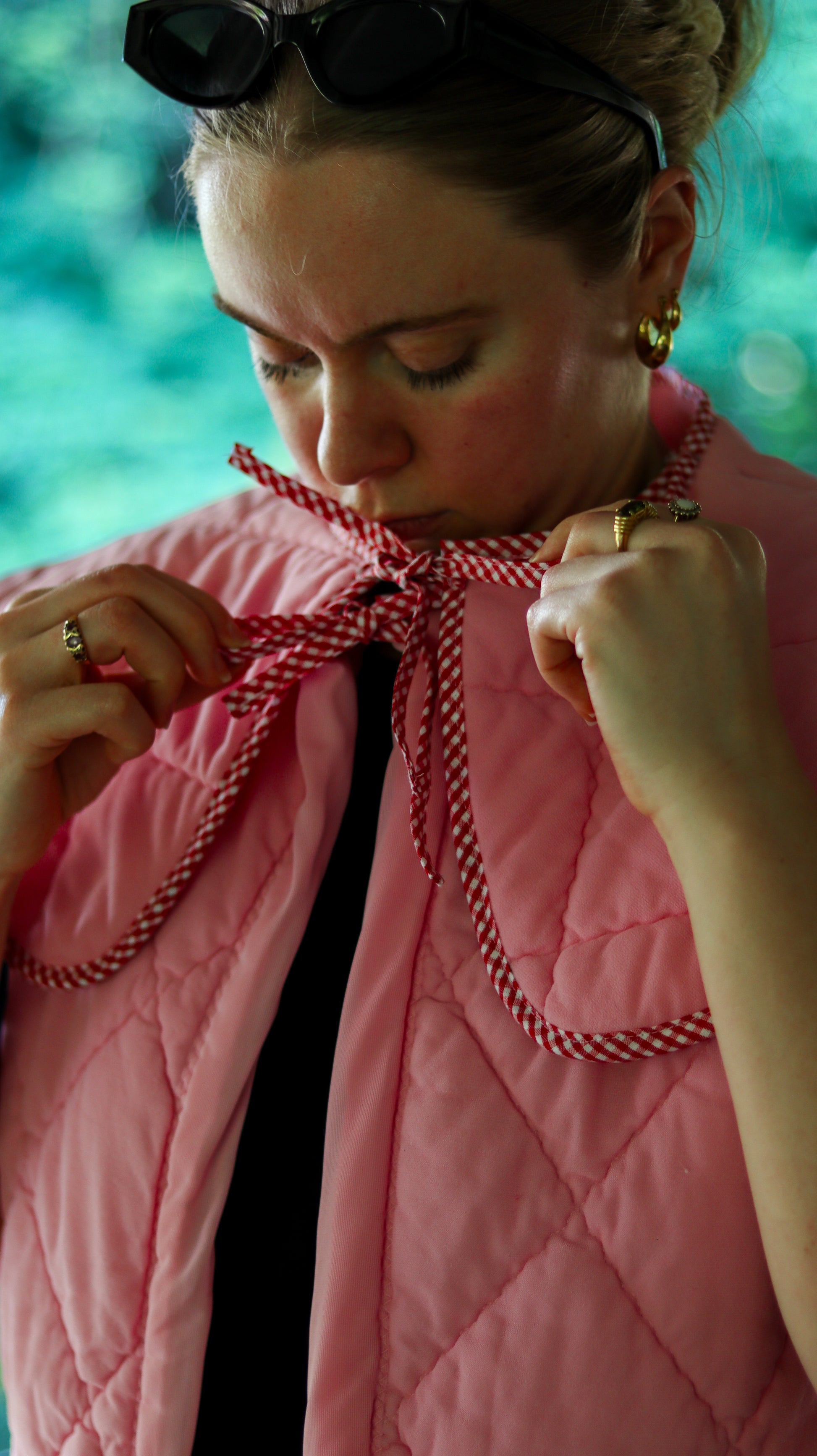 Expertly crafted from up-cycled vintage quilt, the Daisy Gilet features a unique pink design with a touch of red gingham trim. Its tie front and detachable collar add versatility to this one-of-a-kind, environmentally-conscious piece.