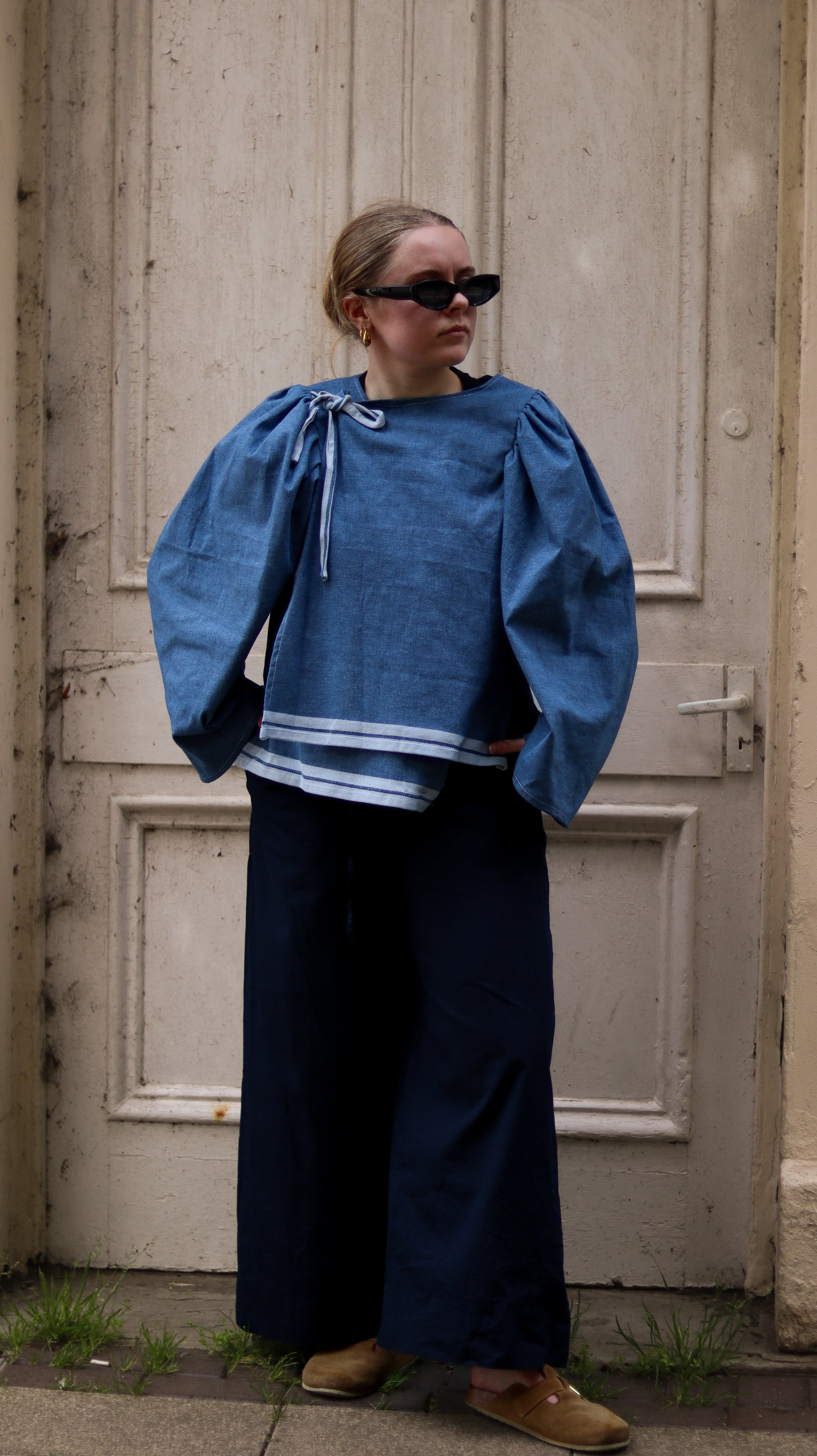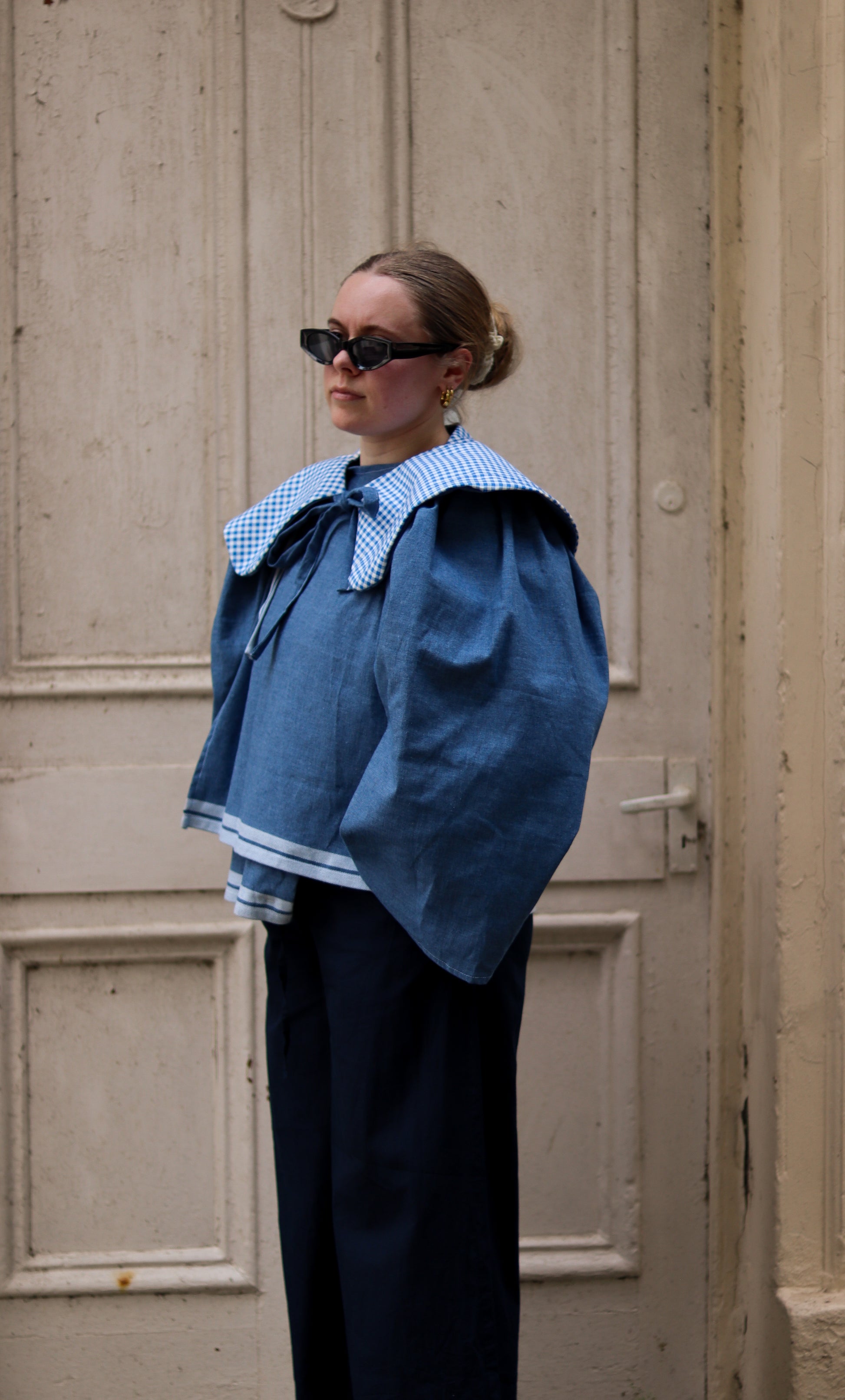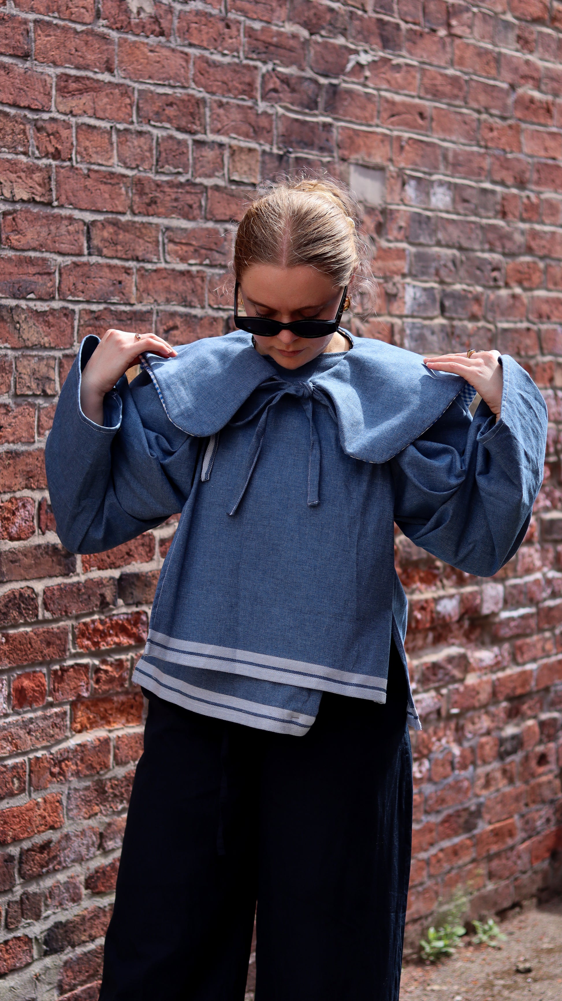 The Dolly Blouse is a stunning piece that combines sustainability and style. Made from up-cycled 100% cotton denim table cloth, it features a unique white trim edge and reversible gingham collar. The puffy sleeves, tie front, and cross over body add effortless charm to this versatile blouse.