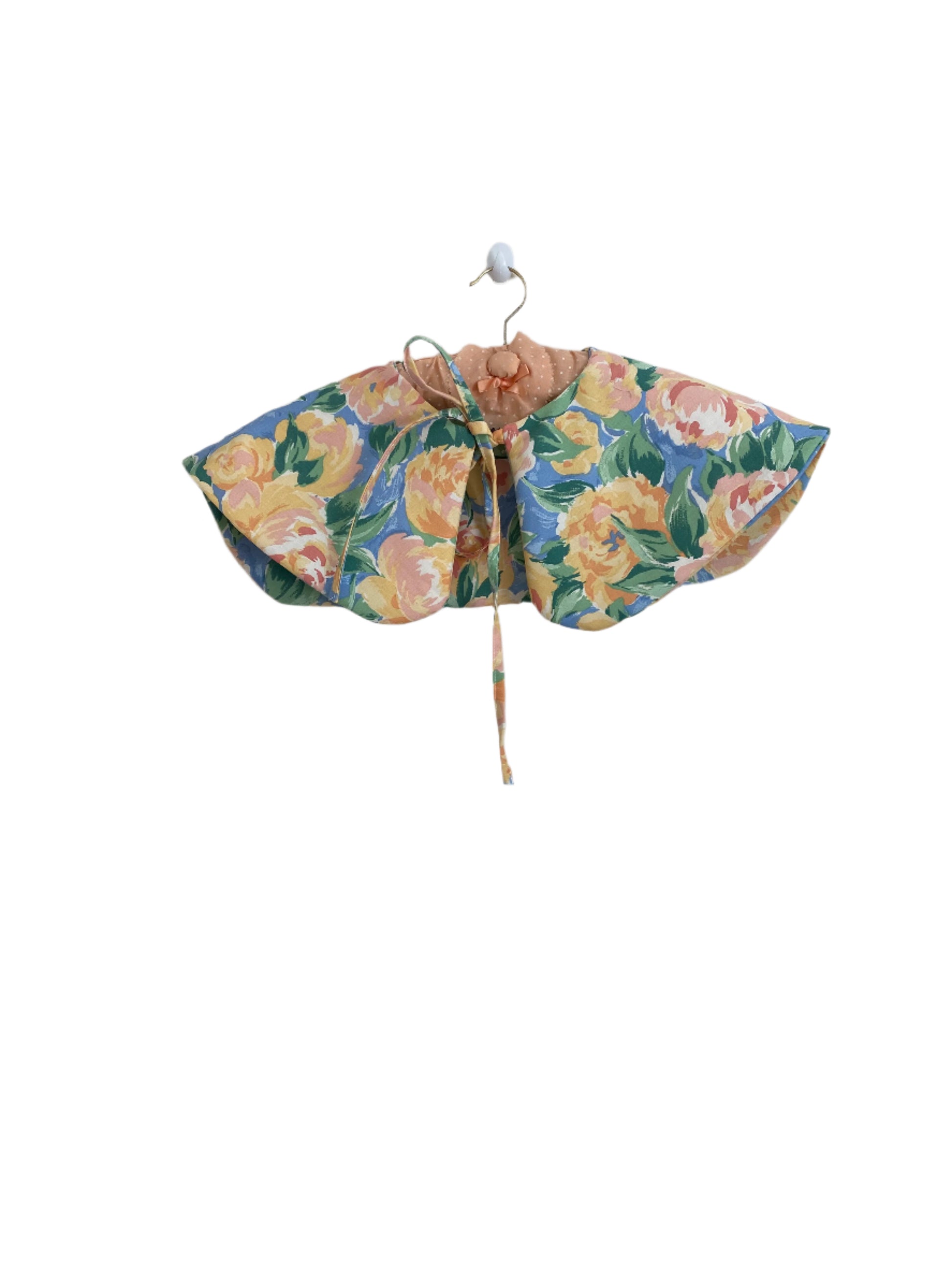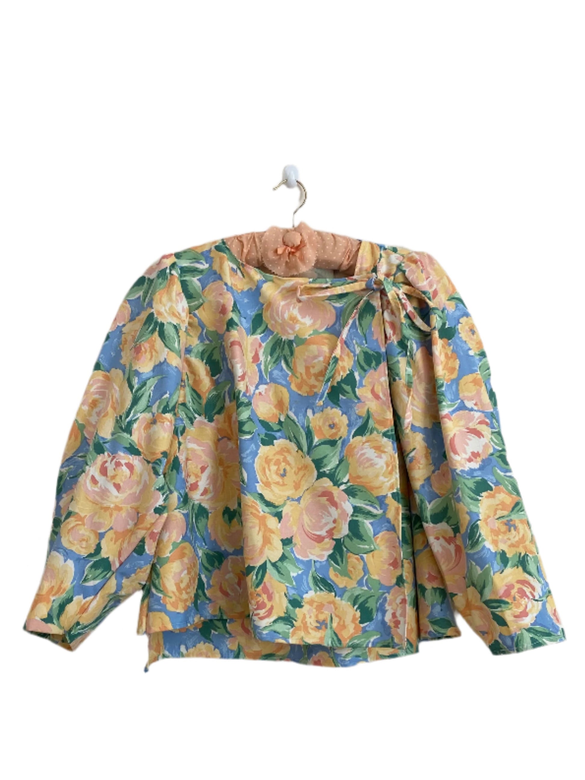 The Eleanor Blouse is a joyful, statement piece upcycled from vintage Laura Ashley curtains, brought back to life in the softest pastel floral print. Designed with a relaxed cross-over fit and shaped, voluminous sleeves, it offers both comfort and drama in just the right balance. The detachable collar adds styling versatility—wear it with for a sweet vintage flair, or without for a simpler silhouette.