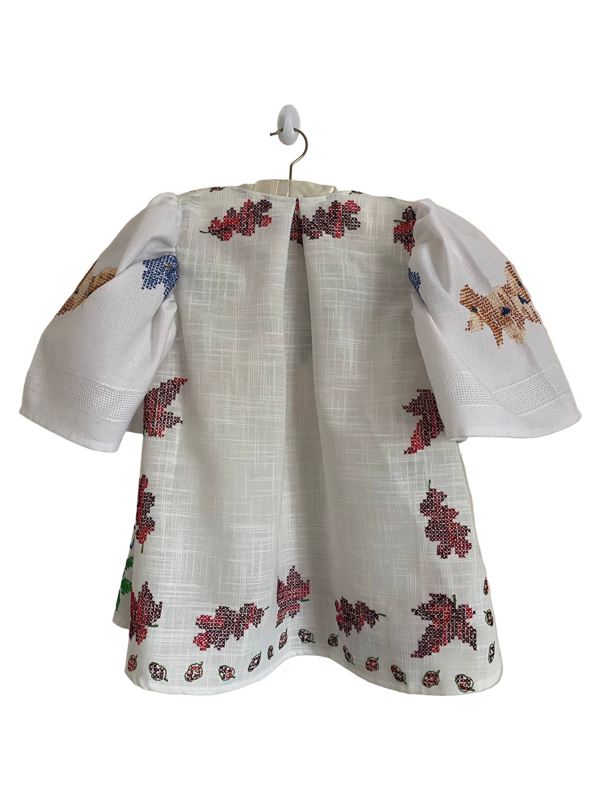 With a 100% linen body and linen/cotton mix sleeves, this piece features beautiful hand embroidery in a tasteful colour palette.