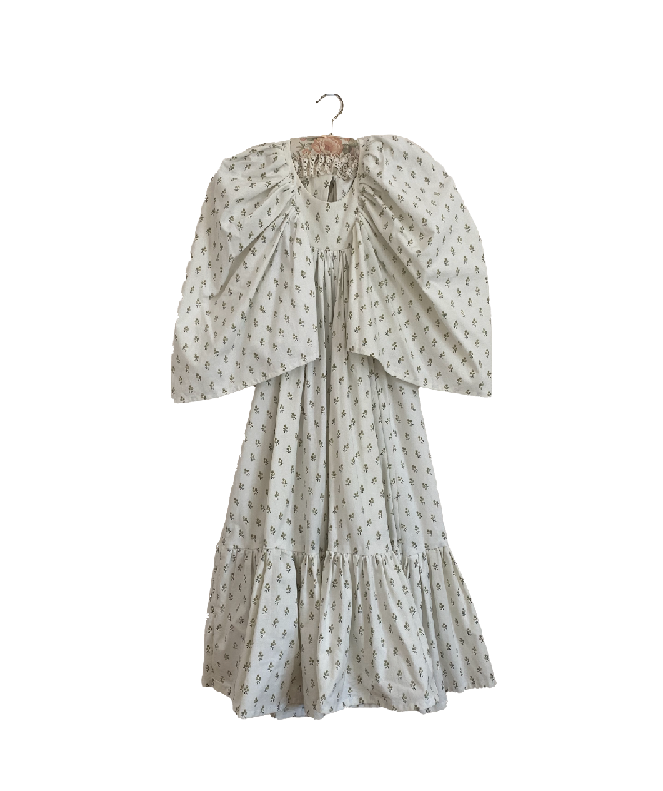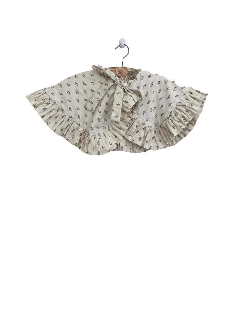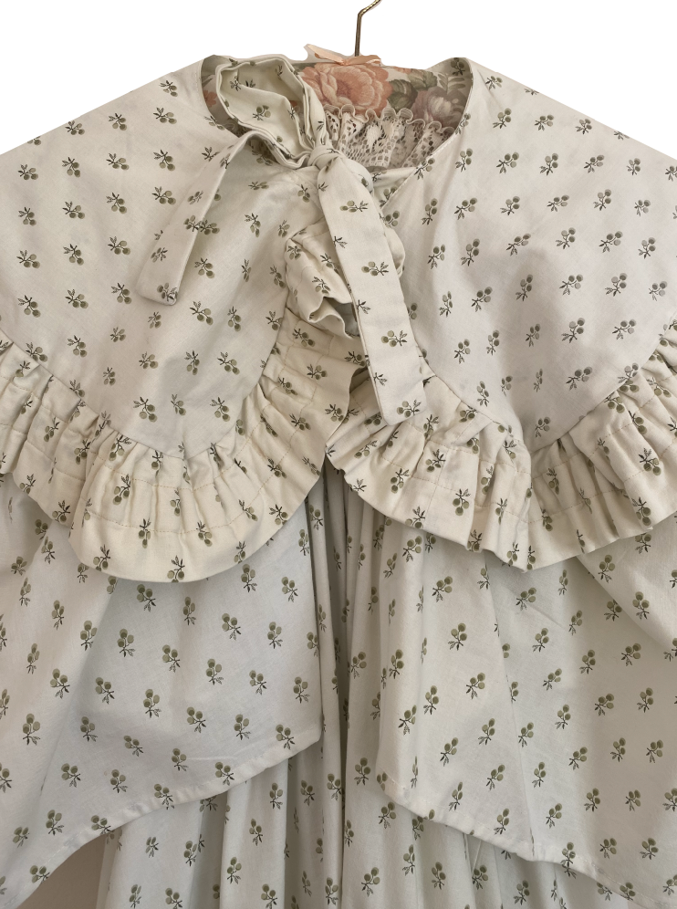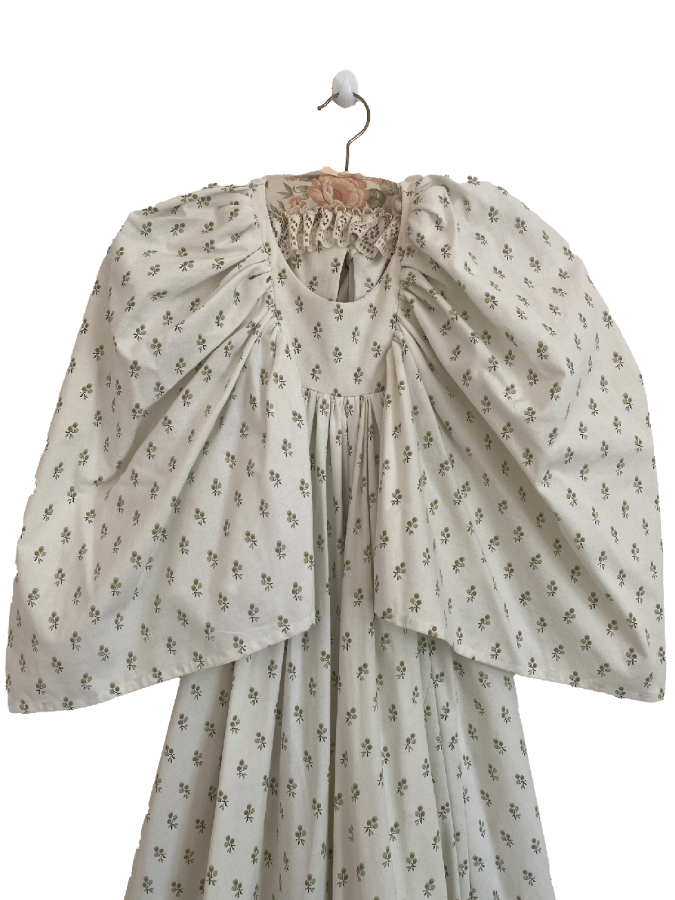 Introducing the Gracie Blouse - crafted from vintage 100% cotton curtains, featuring a delicate white and olive green pattern. Its long puffy sleeves and tie back add a touch of elegance, making it a must-have for any fashion-forward individual. The detachable collar has a frilly edge and tie bow at the front.