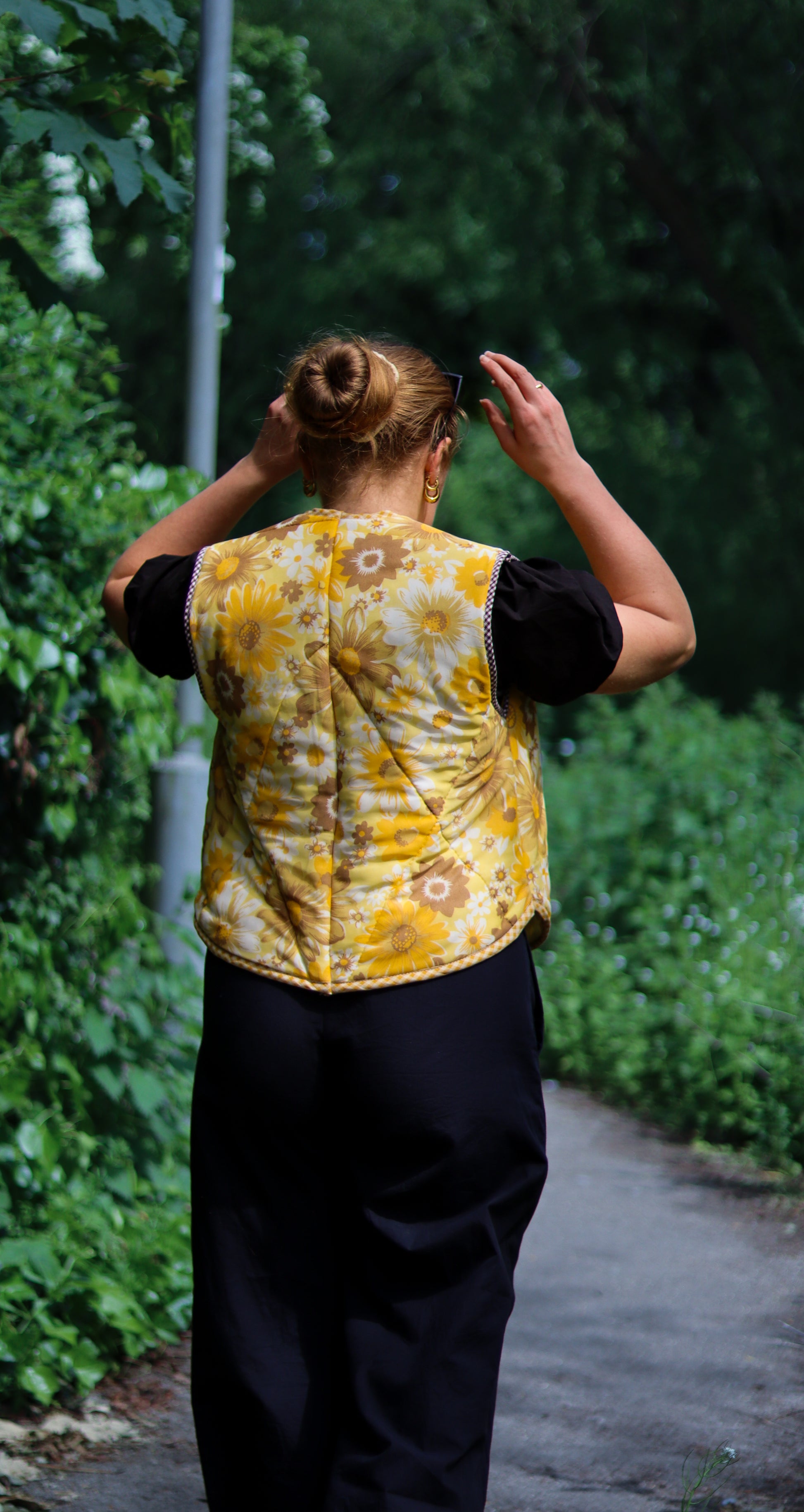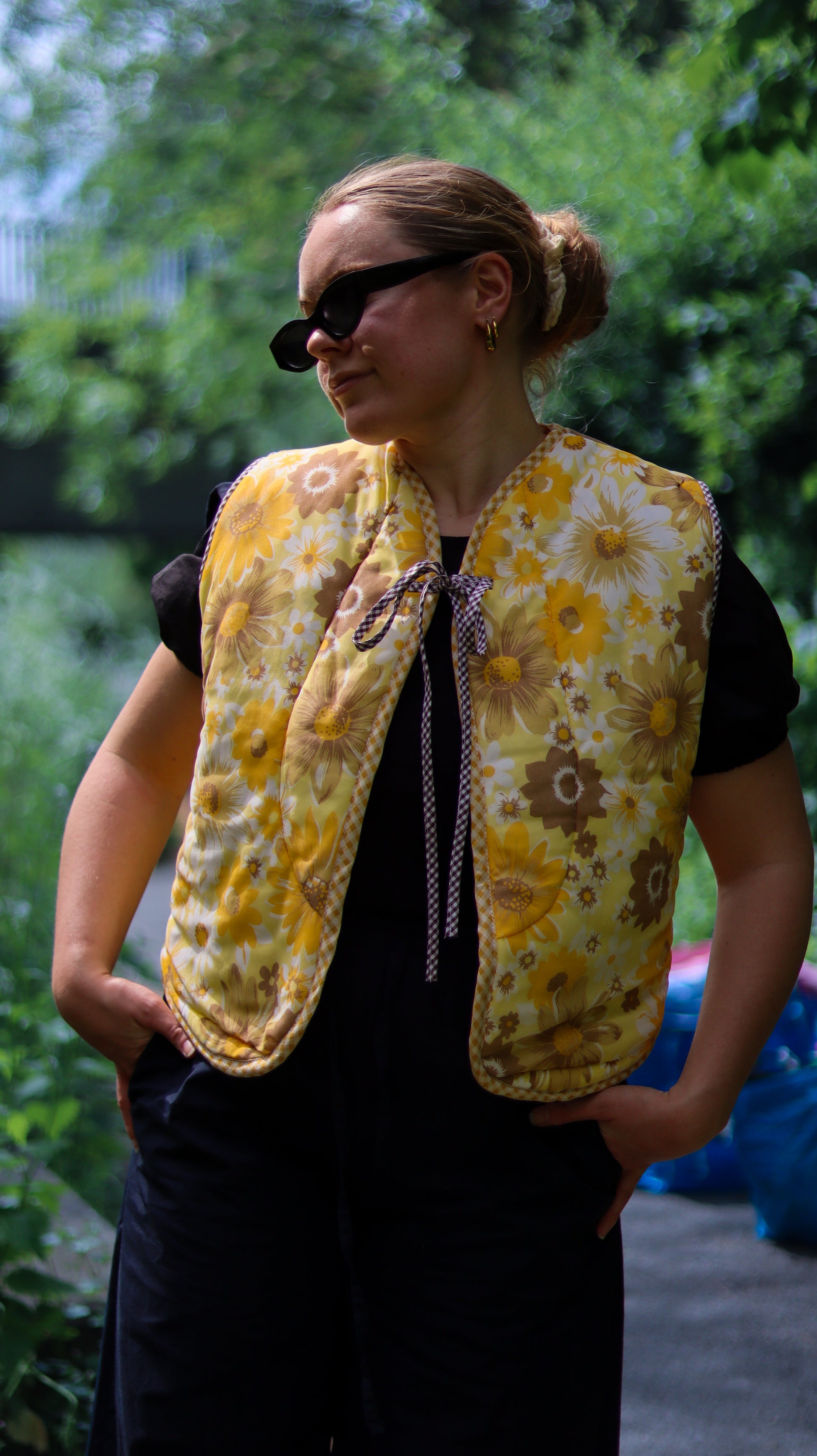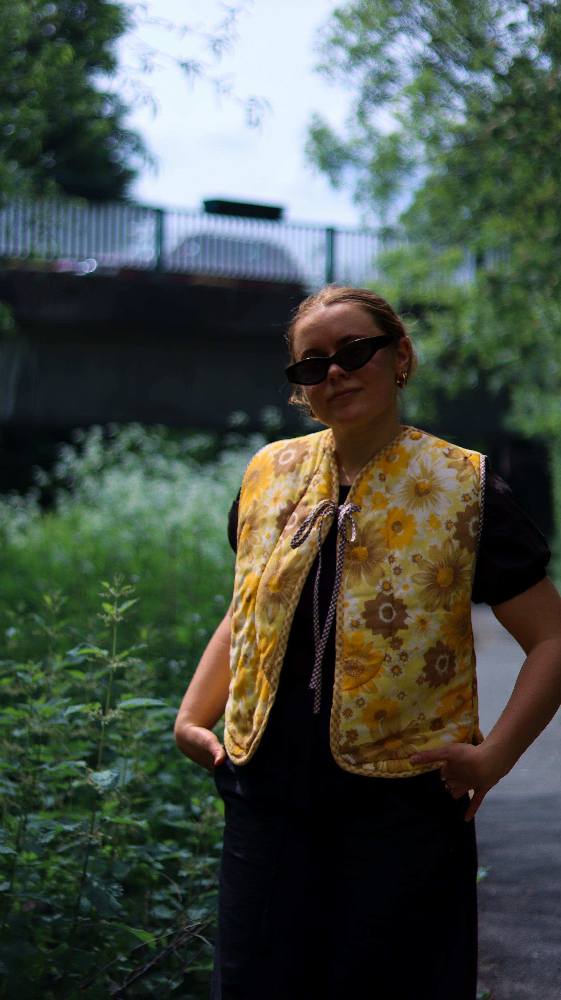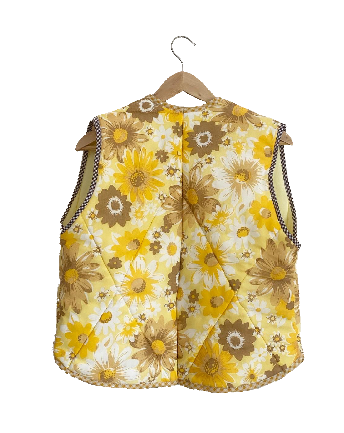 Experience the perfect combination of style and sustainability with our Jesse Gilet. Made from up-cycled vintage bed quilts, this gilet features a vibrant floral print that is both eye-catching and unique. The tie front and curved front design add a touch of elegance, making it a versatile addition to any wardrobe. Stay stylish and environmentally conscious with this one-of-a-kind piece.
