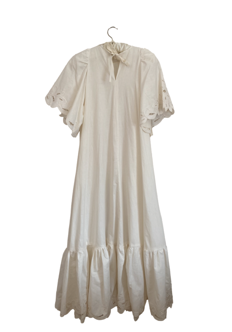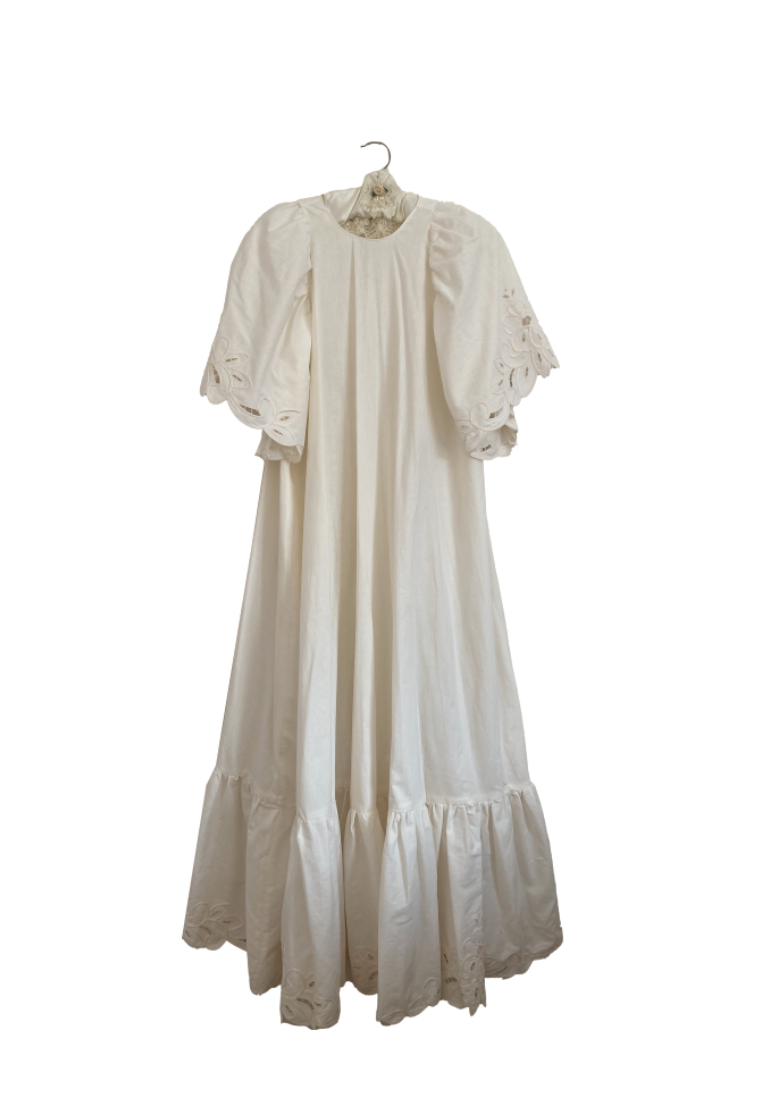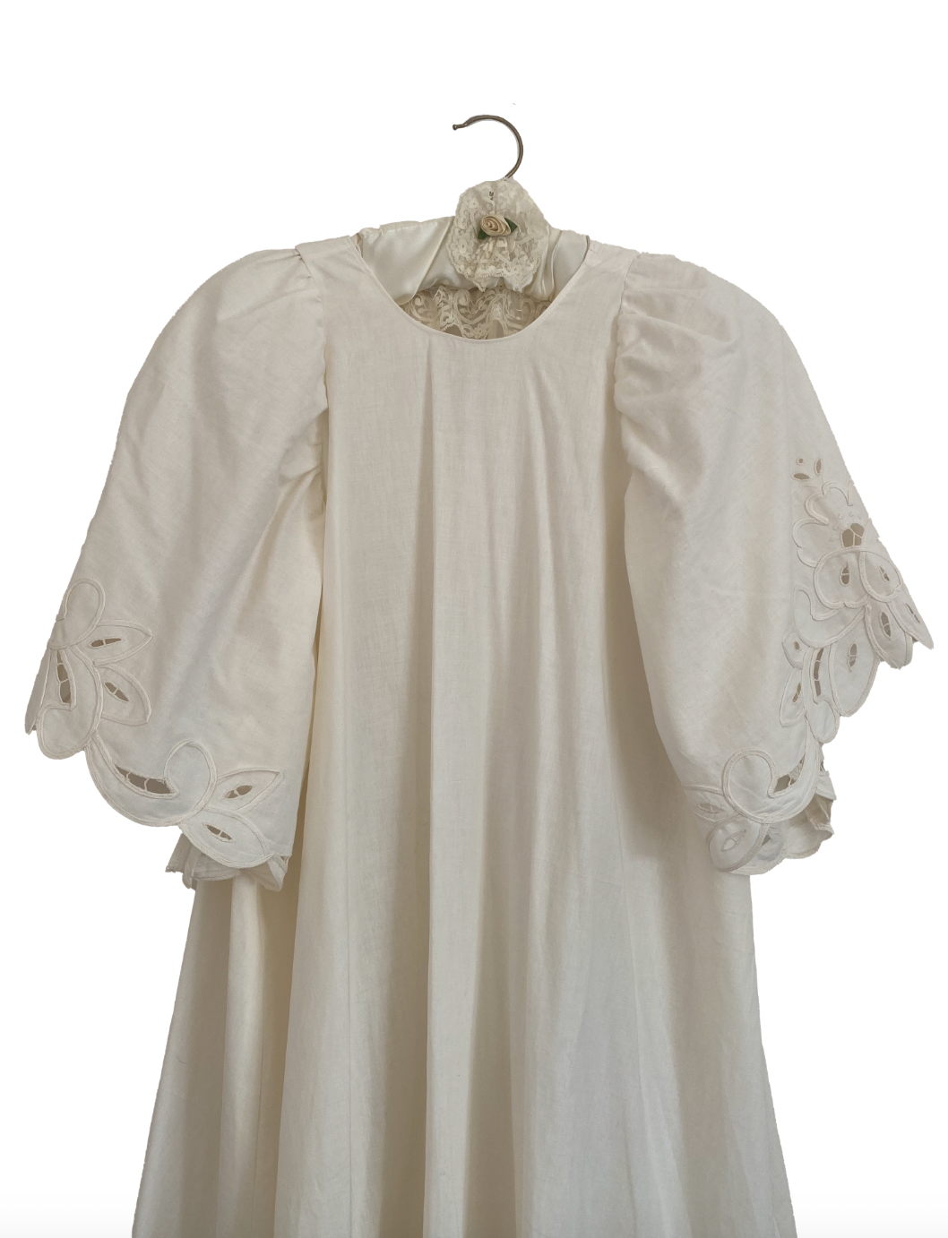 The Lauren Dress is a stunning upcycled piece made from 100% off-white bed linen, featuring elegant embroidered edges. This beautifully crafted dress showcases a flattering tie-back detail with a voluminous skirt creating a flowing silhouette. The flared sleeves, adorned with a delicate edge, add a touch of whimsy and sophistication. Perfect for both casual outings and special occasions, the Lauren Dress effortlessly combines comfort with timeless style.