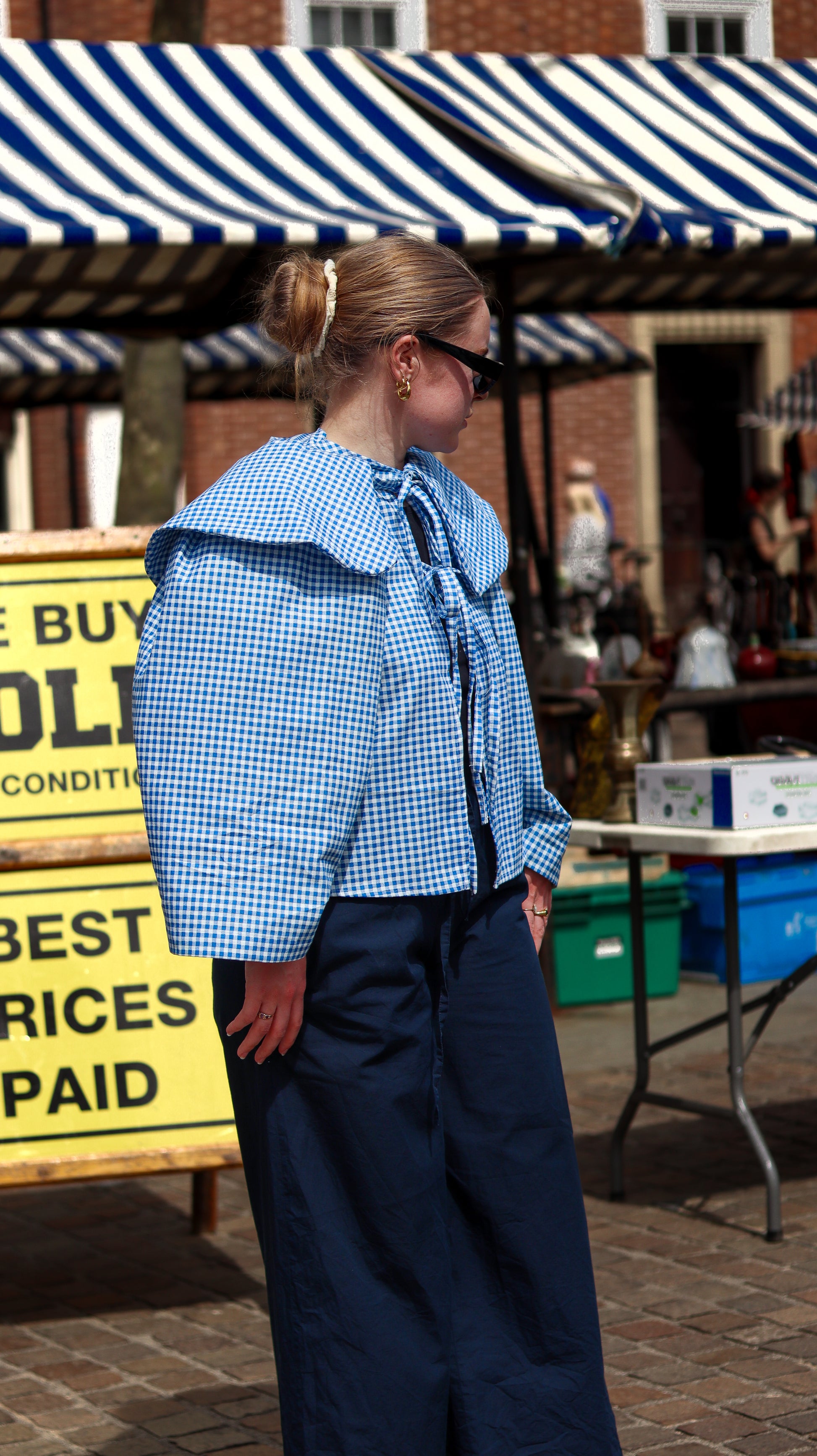 Experience timeless style and sustainability with our Lydia Blouse. Made from upcycled vintage curtains, the small gingham check pattern adds a charming touch. The double front tie and puffy long sleeves showcase a romantic silhouette, while the detachable collar allows for versatile wear.