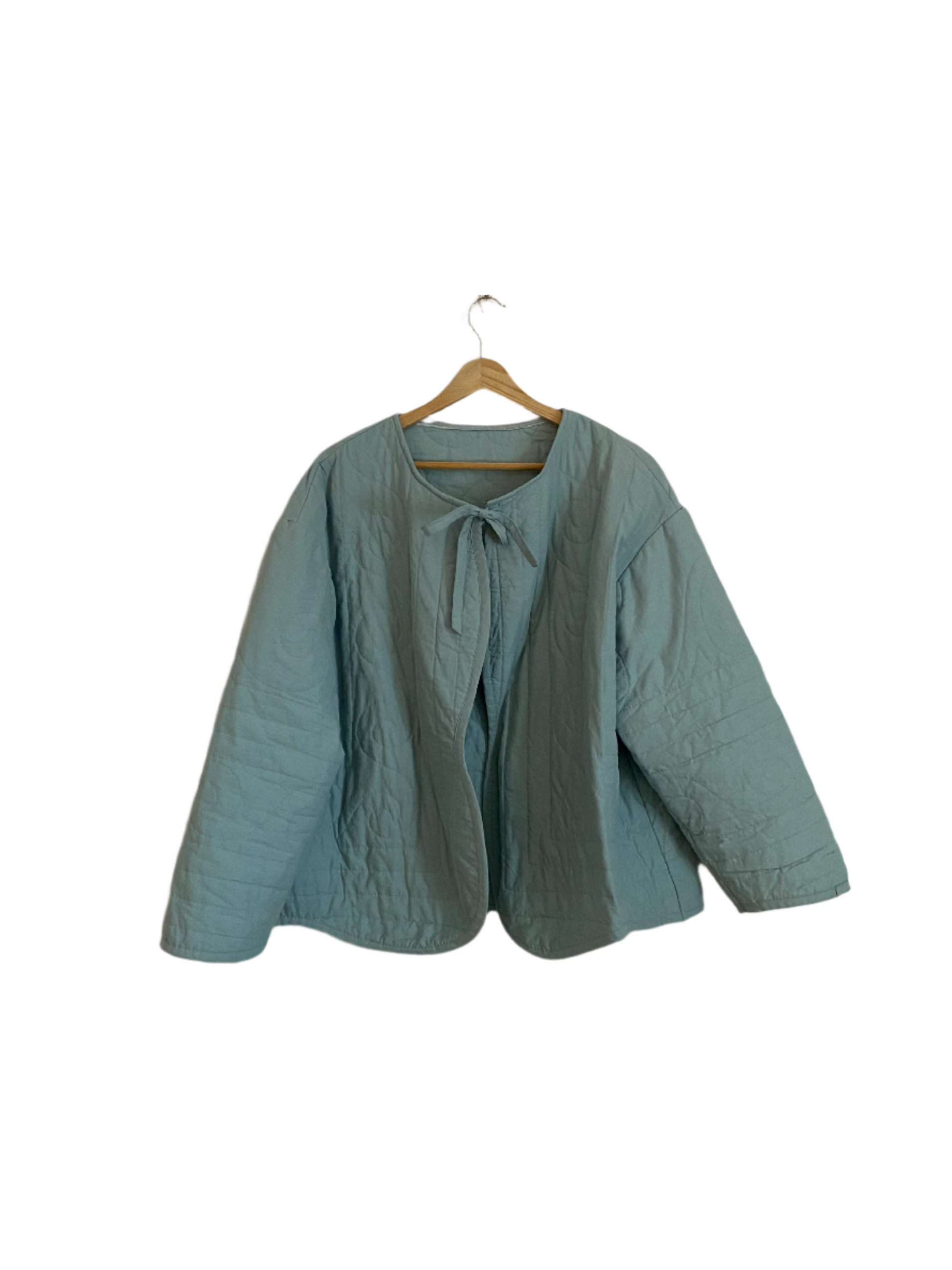 The Mabel Jacket is a handcrafted, upcycled piece made from a vintage bedspread, bringing new life to a cherished textile. Its lightweight design makes it an ideal layering piece for any season. The detachable collar allows for versatile styling, while the front ties add a touch of elegance and functionality, making it perfect for a boxy, flattering fit. This jacket is not only a statement of sustainability but also a unique and timeless addition to any wardrobe. The peachy orange tones coming through in the fabric give this piece a modern twist.
