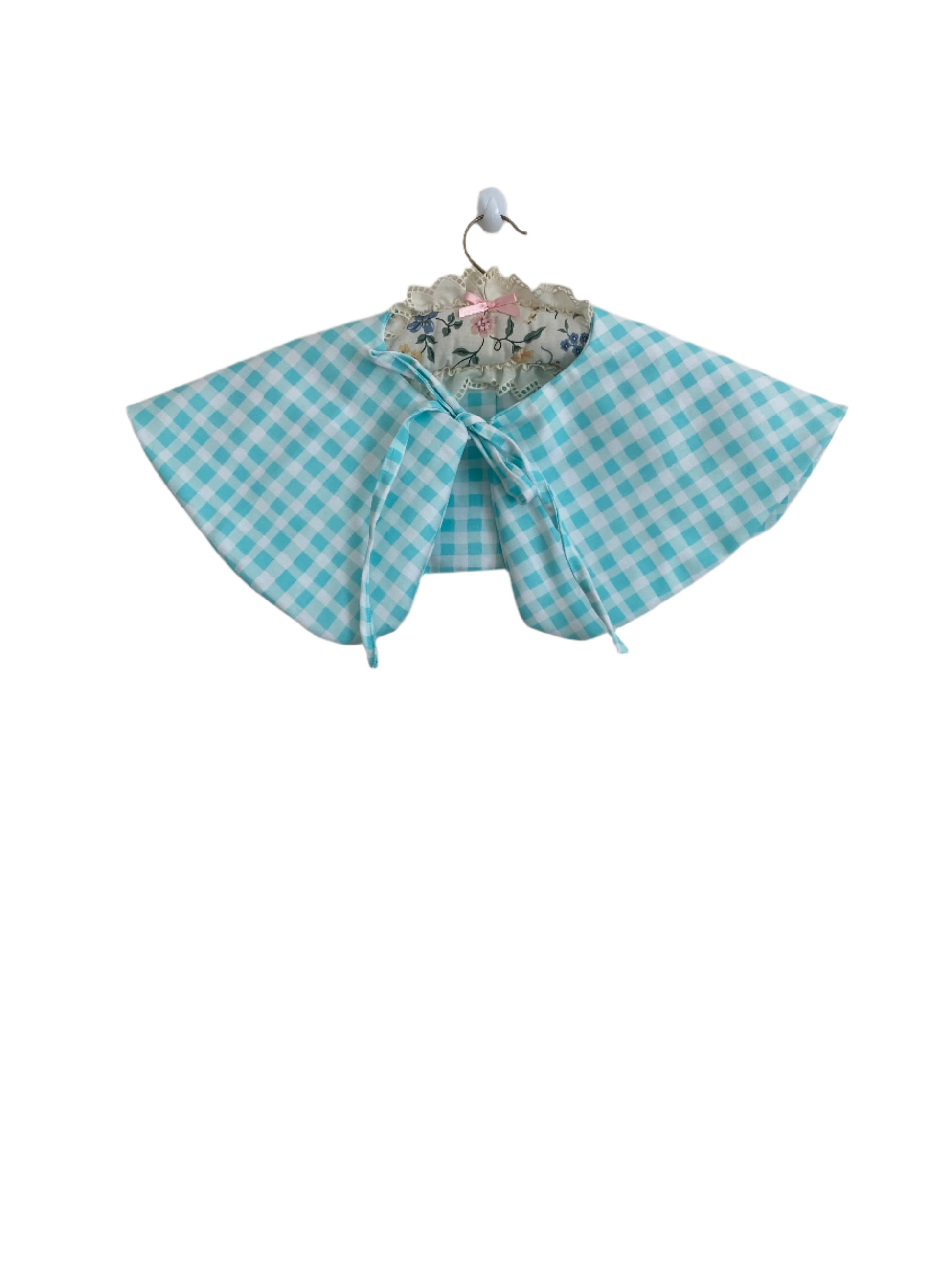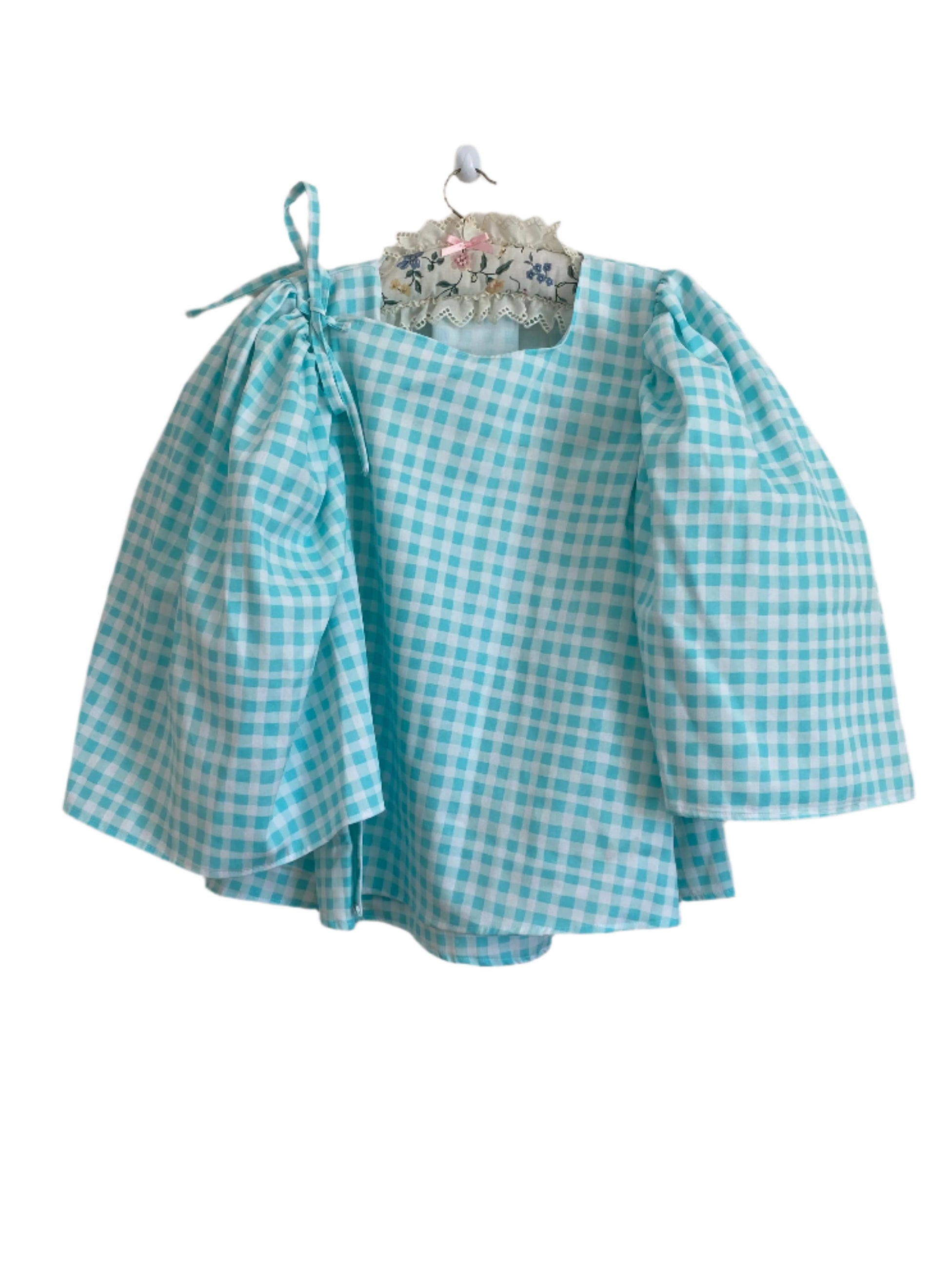 The Nora blouse is a one-off piece, upcycled from vintage second-hand curtains into something truly special. Featuring a bold aqua blue gingham print, it brings new life to old textiles with a fresh, playful feel. Designed with a cross-over bodice and a relaxed fit, it’s comfortable, flattering, and easy to wear. A detachable collar lets you switch up the look—classic and sweet with it on, or effortlessly casual without.