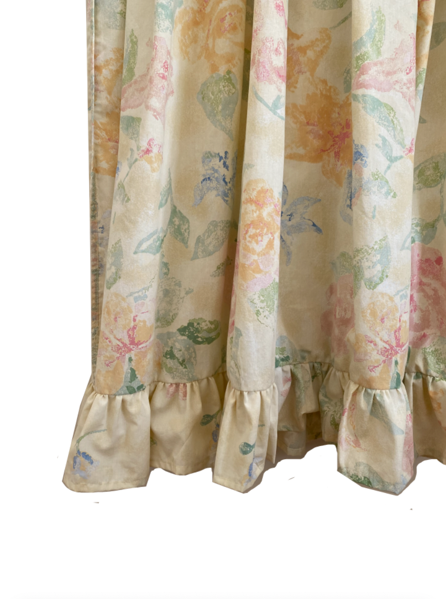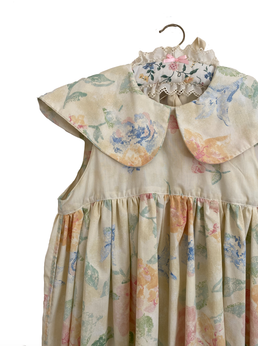 The Polly dress is a delightful creation made from up-cycled vintage floral bed linen. It features a cropped bib section, a full-volume skirt, and a tiered bottom frill, all designed to evoke a playful, feminine charm. The attached collar adds a sweet touch, while the simple tie at the back ensures a comfortable fit. Perfect for layering, this dress is ideal for achieving an adorable, girly look!