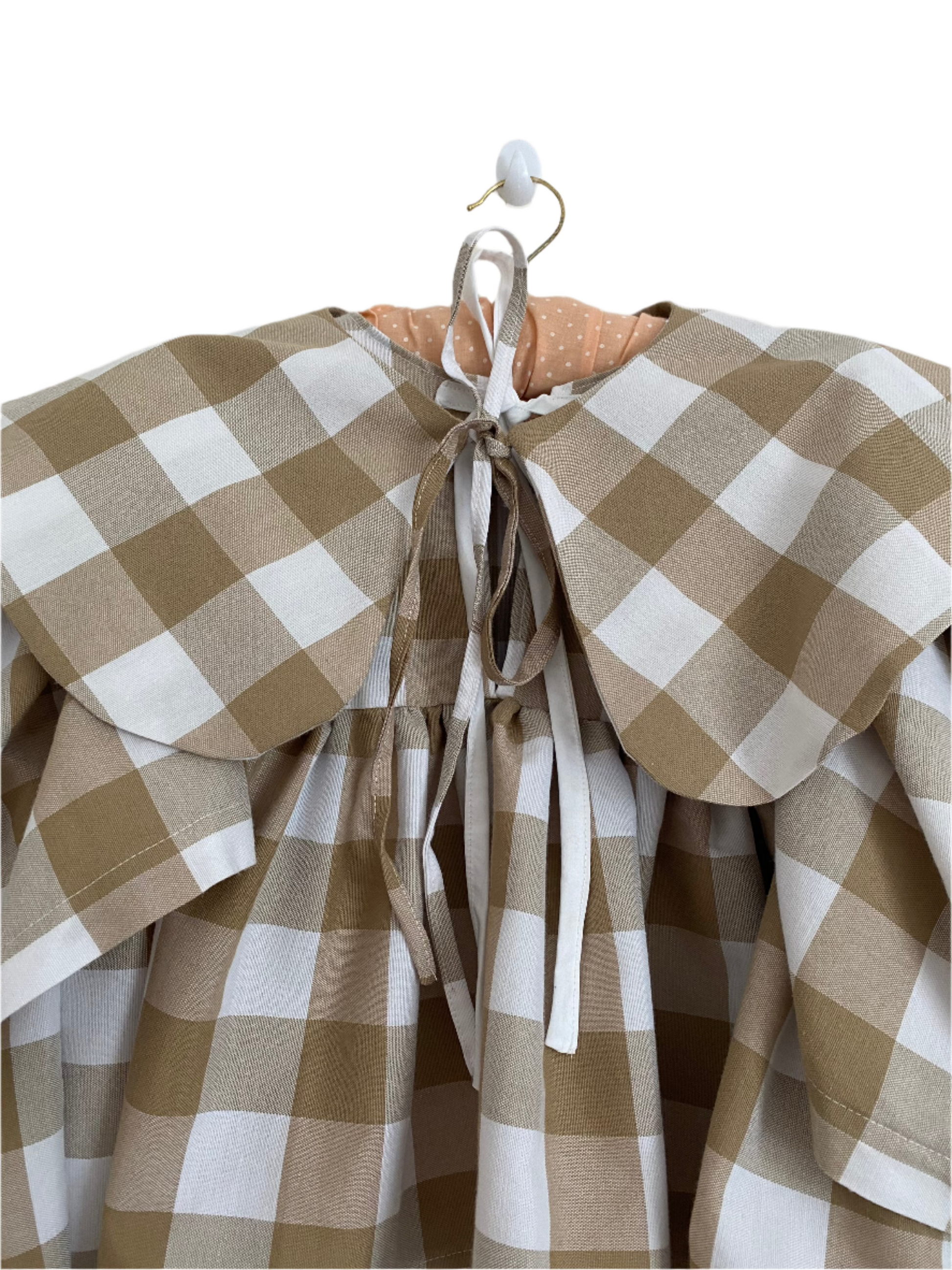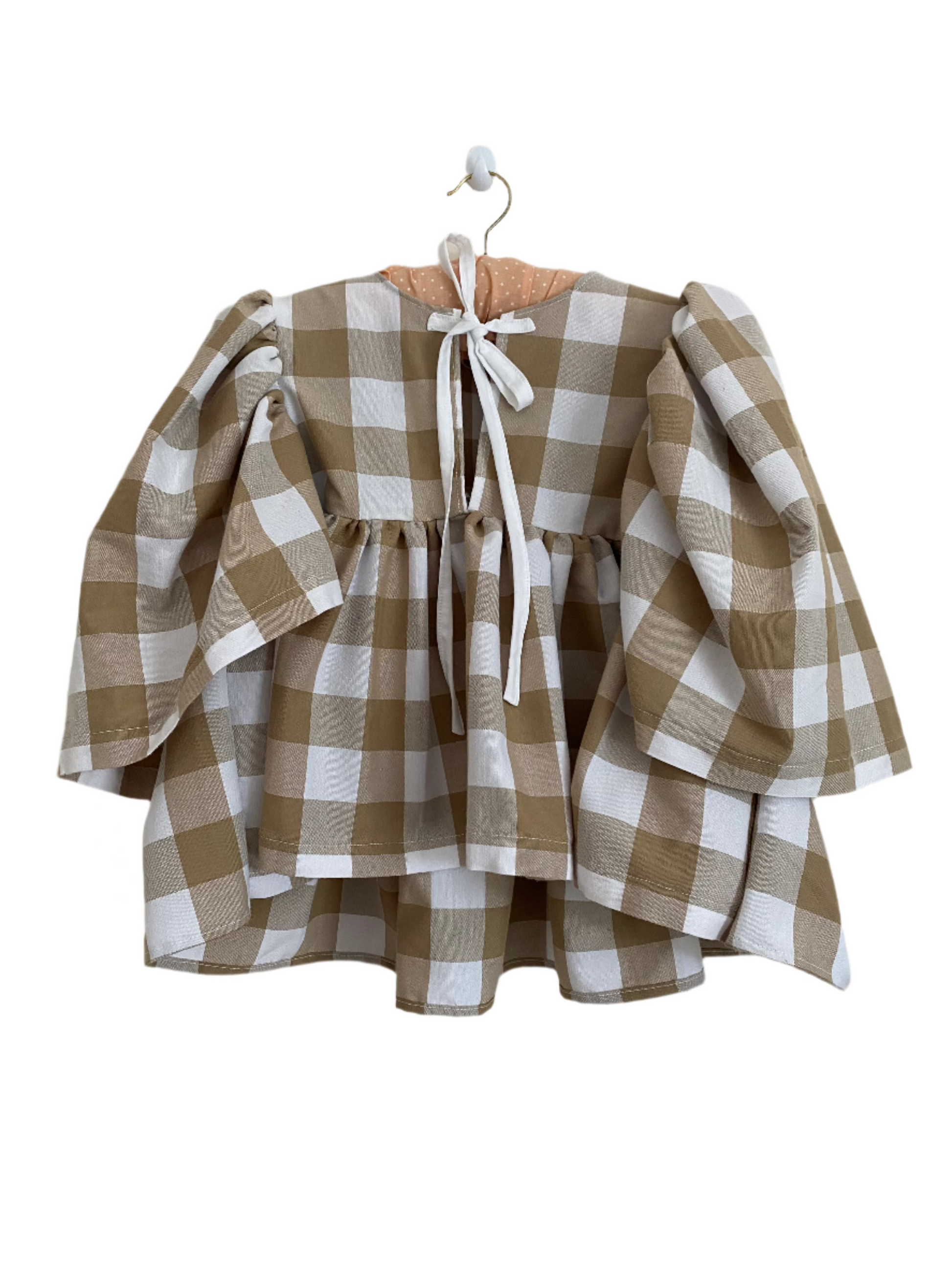 The Poppy Blouse is crafted from a vintage tablecloth, reimagined into a bold statement piece. Featuring a classic gingham check in neutral and white tones, it includes a tie-back fastening and a detachable collar for versatile styling. The structured bib connects to a voluminous lower section, making it the perfect pairing with wide-leg trousers.