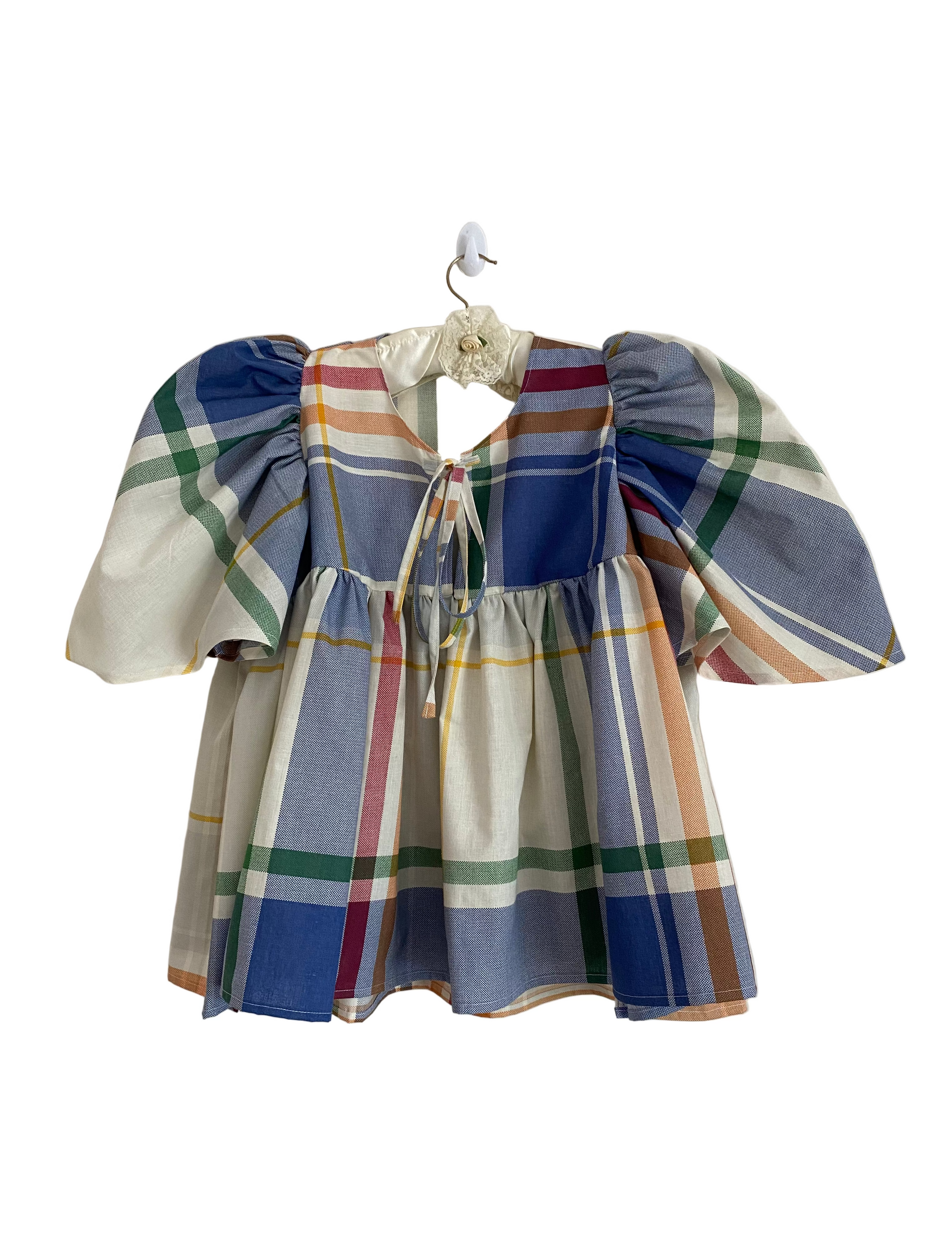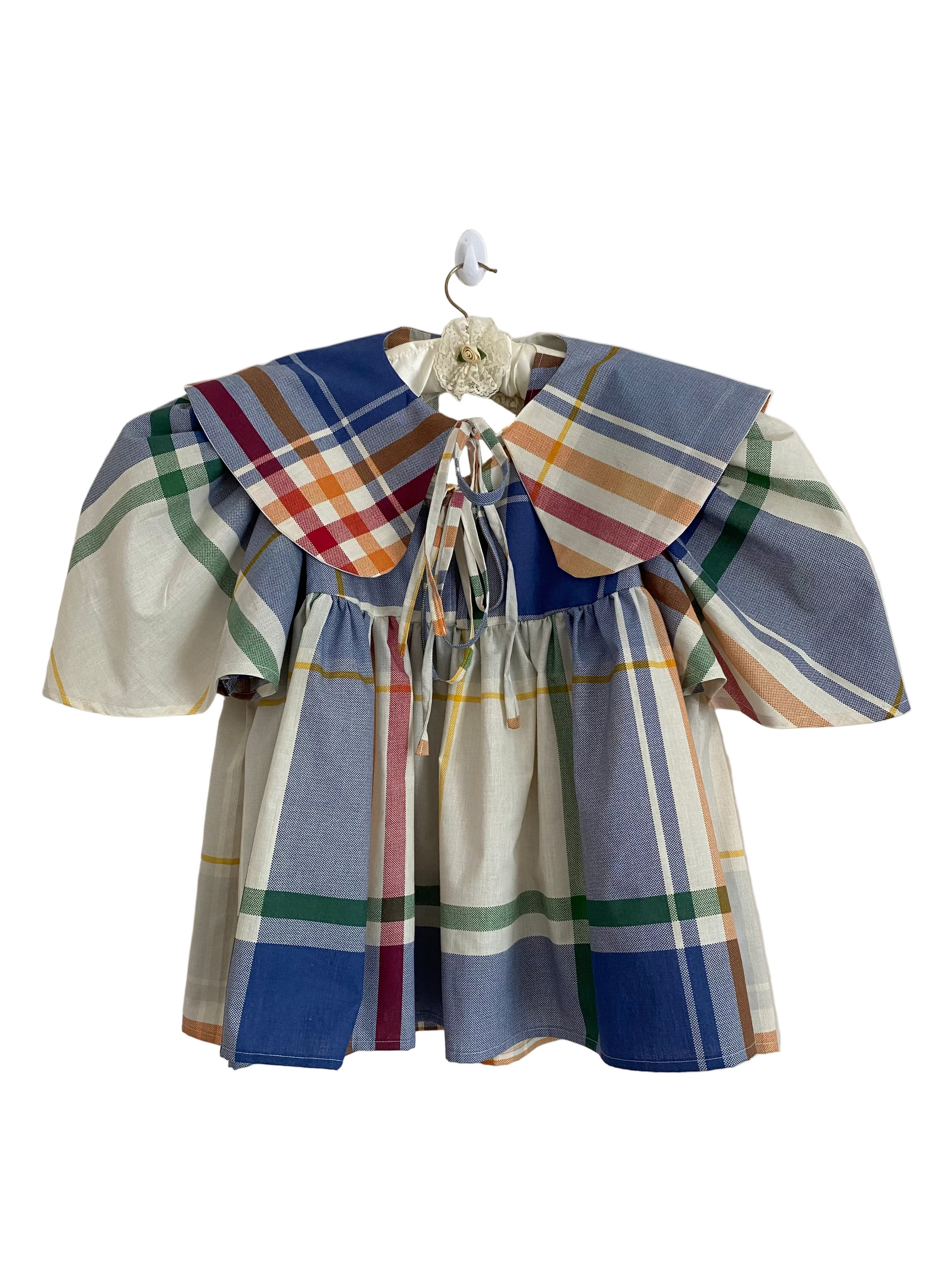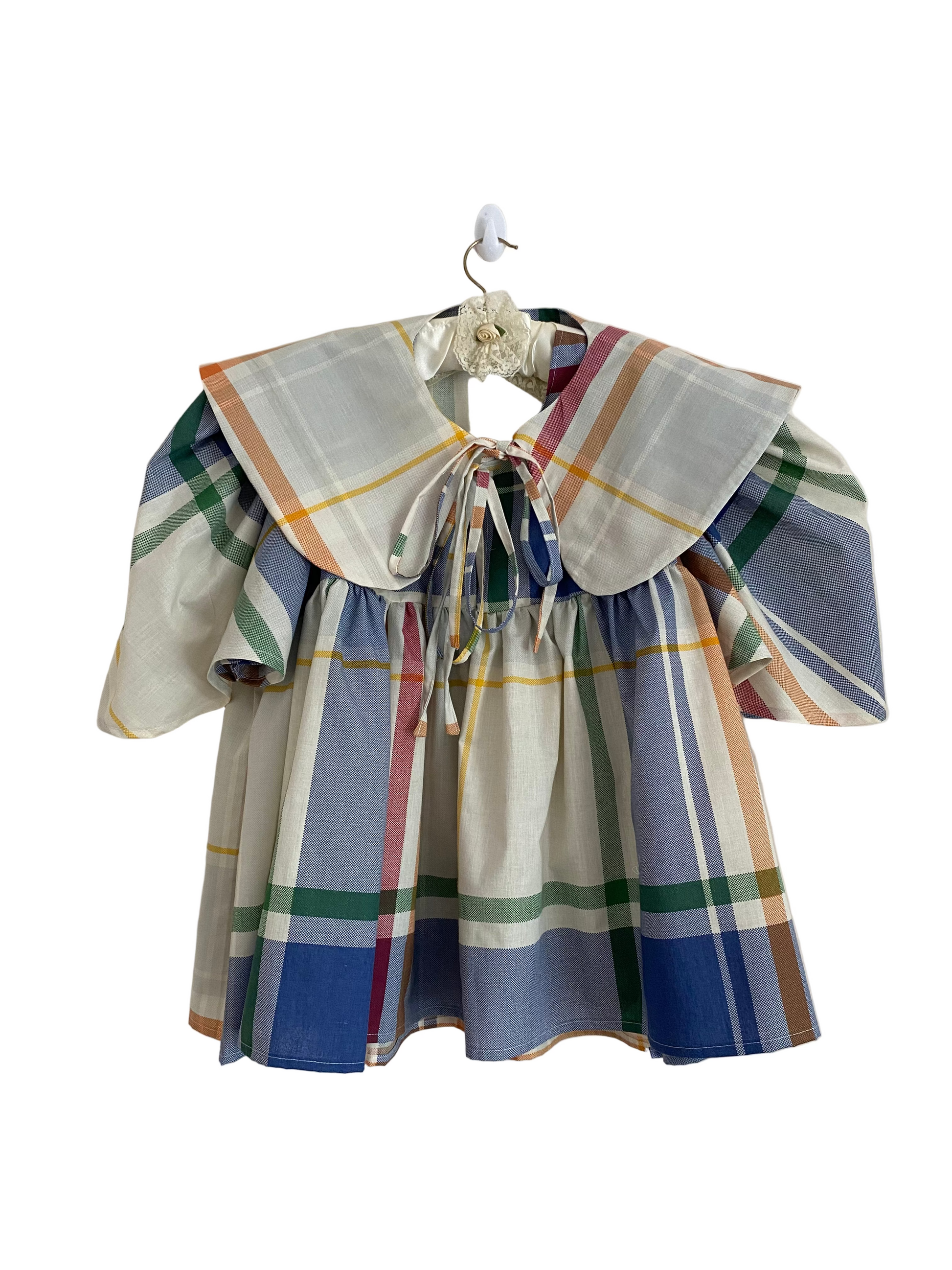 The Roseanna blouse is a one-off piece, upcycled from vintage second-hand curtains into something truly special. Featuring a bold colourful check print, it brings new life to old textiles with a fresh, playful feel. Designed with a tie bodice and a relaxed fit, it’s comfortable, flattering, and easy to wear. A detachable collar lets you switch up the look—classic and sweet with it on, or effortlessly casual without.