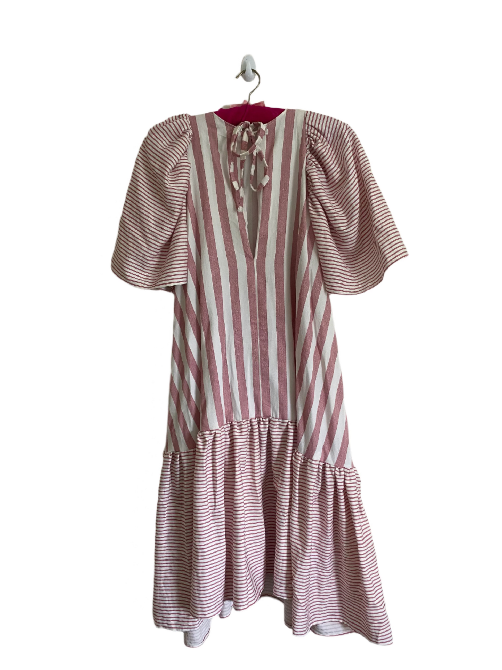 The Annie Midi Dress has been up-cycled from vintage bed linens, featuring a beautifully fresh red stripe that feels both classic and crisp. Carefully crafted to drape and flow with ease, this dress is designed for comfort without compromising on style. It comes with a detachable collar, giving you the option to change up the look depending on your mood. The Annie is effortless, timeless, and full of quiet charm.