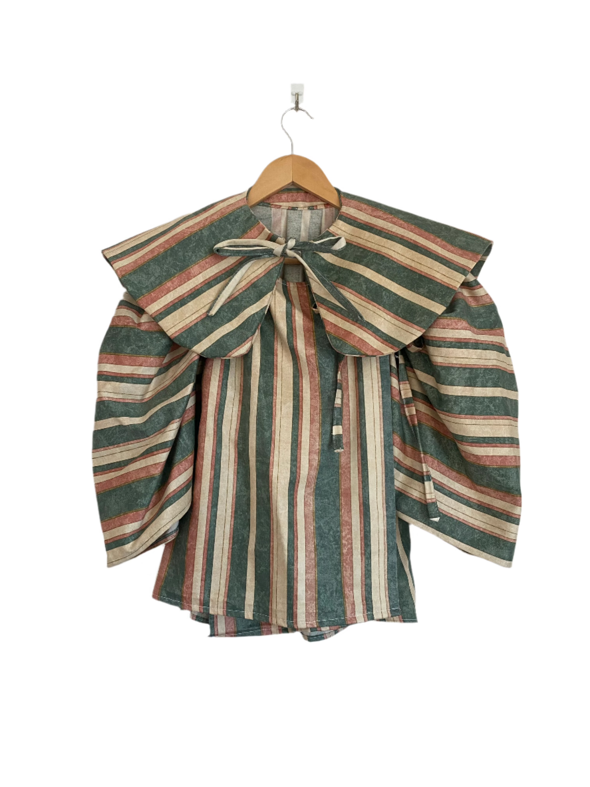 The Faith blouse is the ideal autumn piece for layering as the weather cools. Featuring a crossover front and detachable collar, it offers a relaxed, boxy fit. With its voluminous puffy sleeves and adjustable ties, this blouse can be worn casually over everyday outfits or styled as a jacket over a dress for a more elevated look.