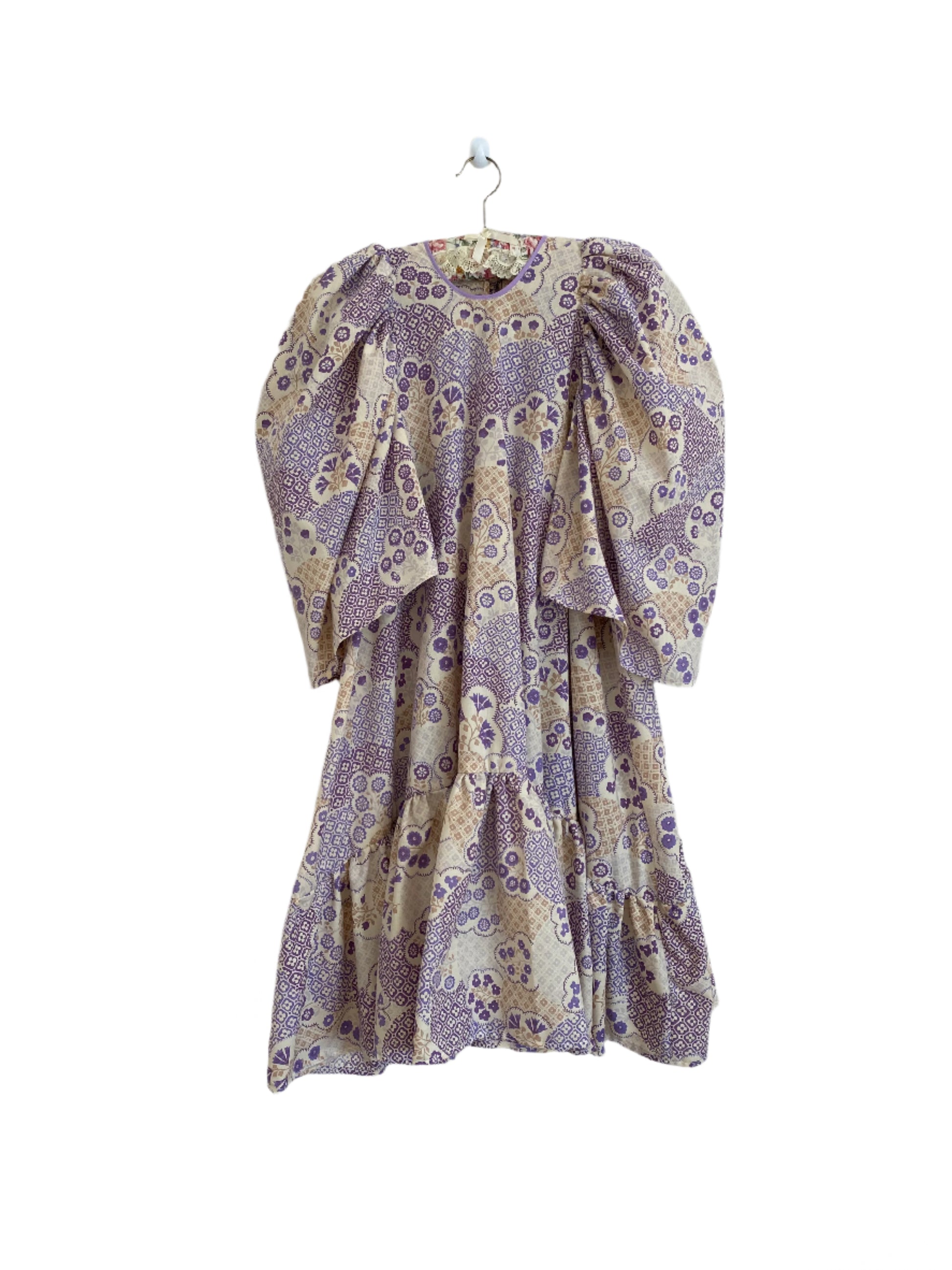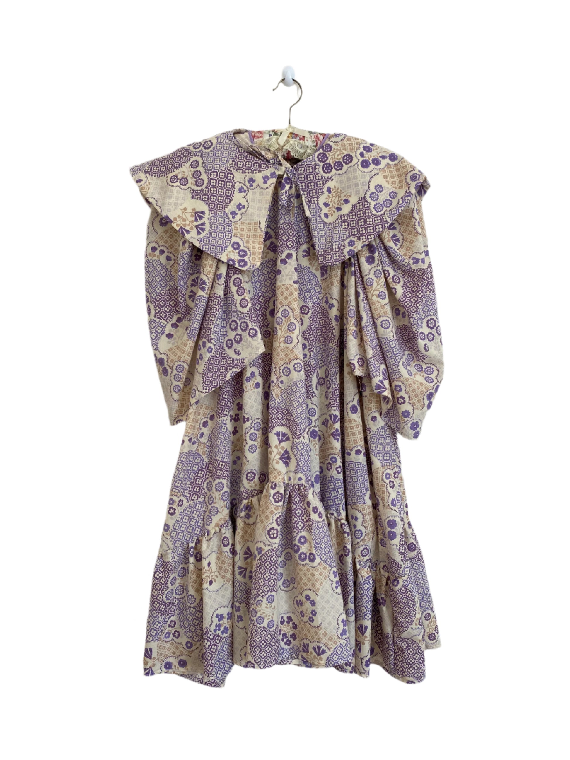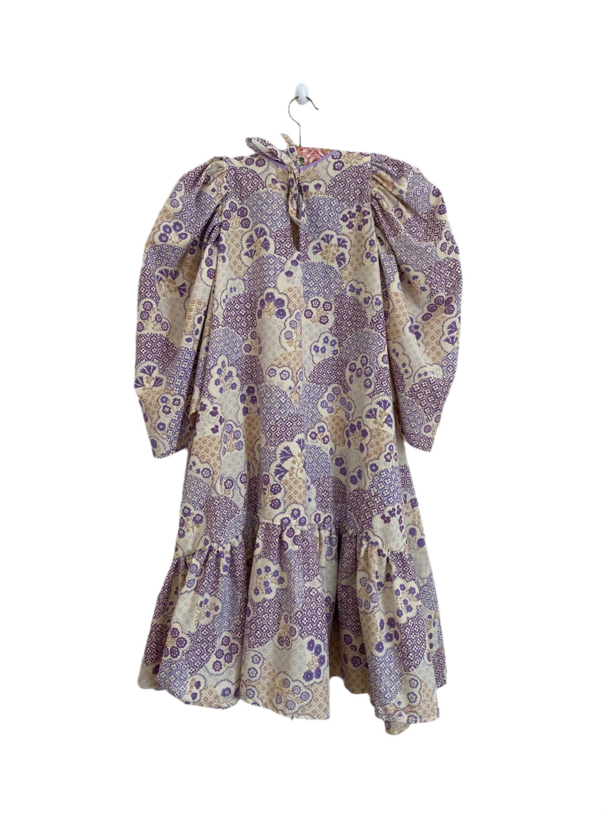 Whimsical and one-of-a-kind, the Vera Blouse is crafted from an up-cycled vintage duvet, giving new life to beautiful materials. Featuring a rich purple-based pattern, it has a loose, airy fit with a voluminous skirted hem and soft, puffy sleeves for a romantic silhouette. A delicate tie at the back allows you to adjust the shape, while the detachable collar lets you style it your way — classic or playful. Thoughtfully made, endlessly charming.