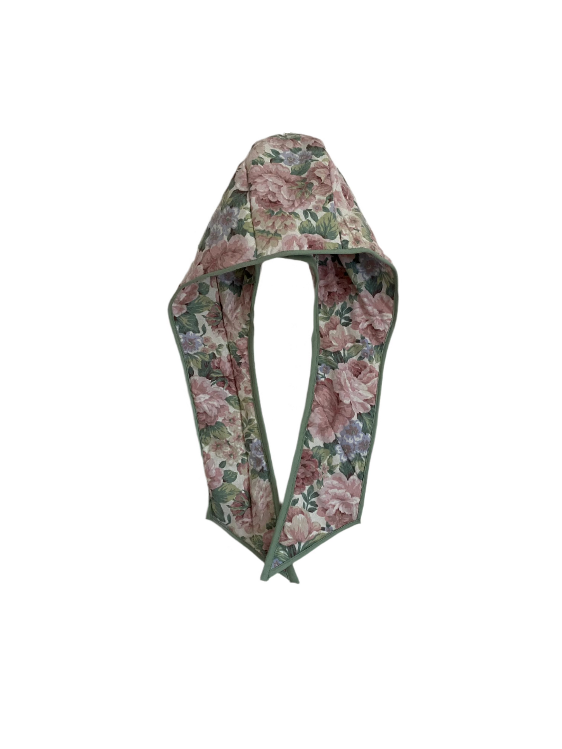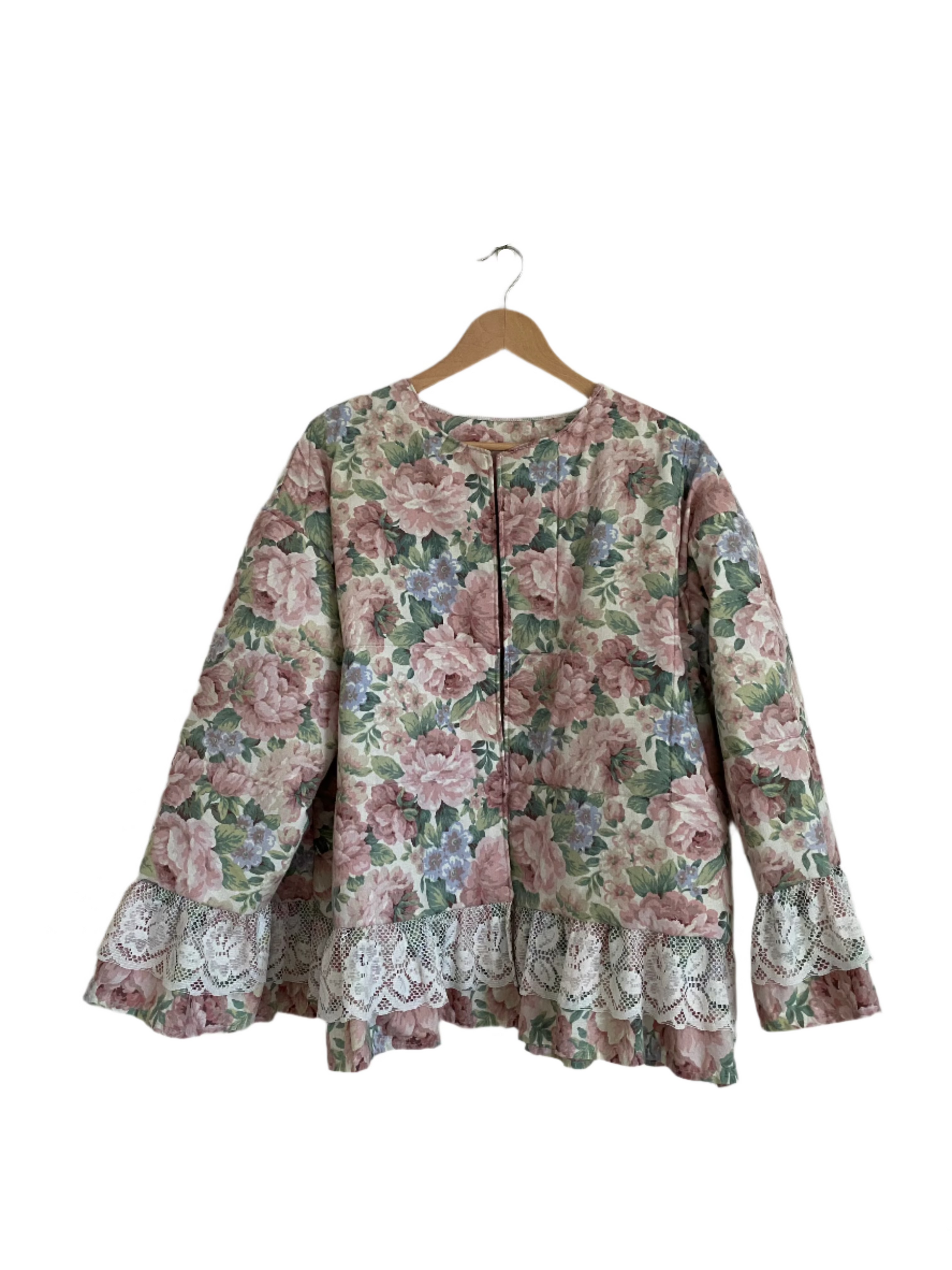 The Winifred Jacket is a unique, one-of-a-kind creation made from a vintage floral quilt, showcasing the beauty of upcycled craftsmanship. With its boxy fit, it offers a relaxed yet stylish silhouette that’s perfect for layering. The delicate lace trim across the hem and cuffs adds a touch of vintage charm and femininity, making it a truly special piece. A perfect balance of comfort, elegance, and sustainability, the Winifred Jacket is a timeless addition to any wardrobe.The Winifred Jacket also features both a detachable collar and a hood, each with a subtle sage green edge that adds a soft pop of colour.